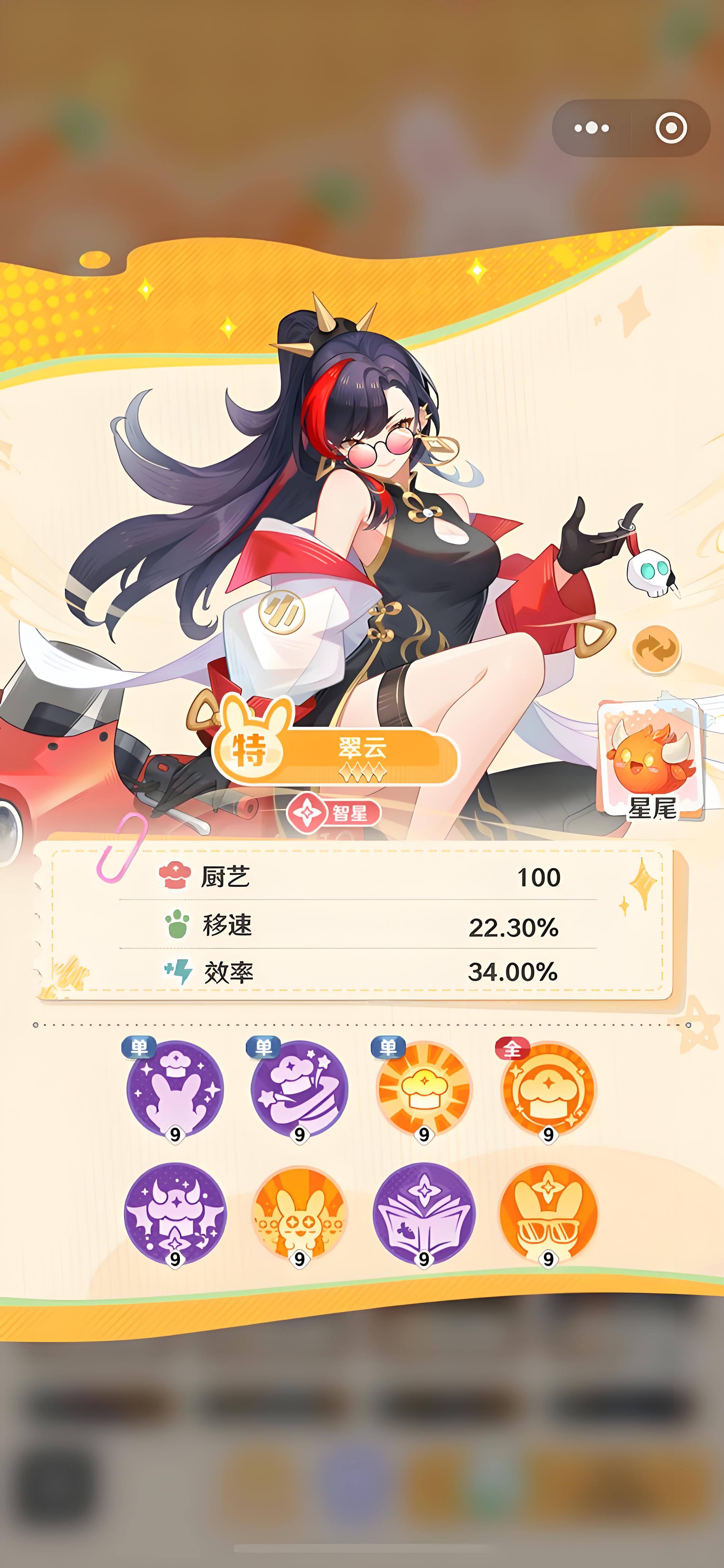 1、角色是自帶智星特質的核心店員,搭配相同特質店員或廚具時各項能力顯著提升,基礎廚藝值100分且效率加成達34%。