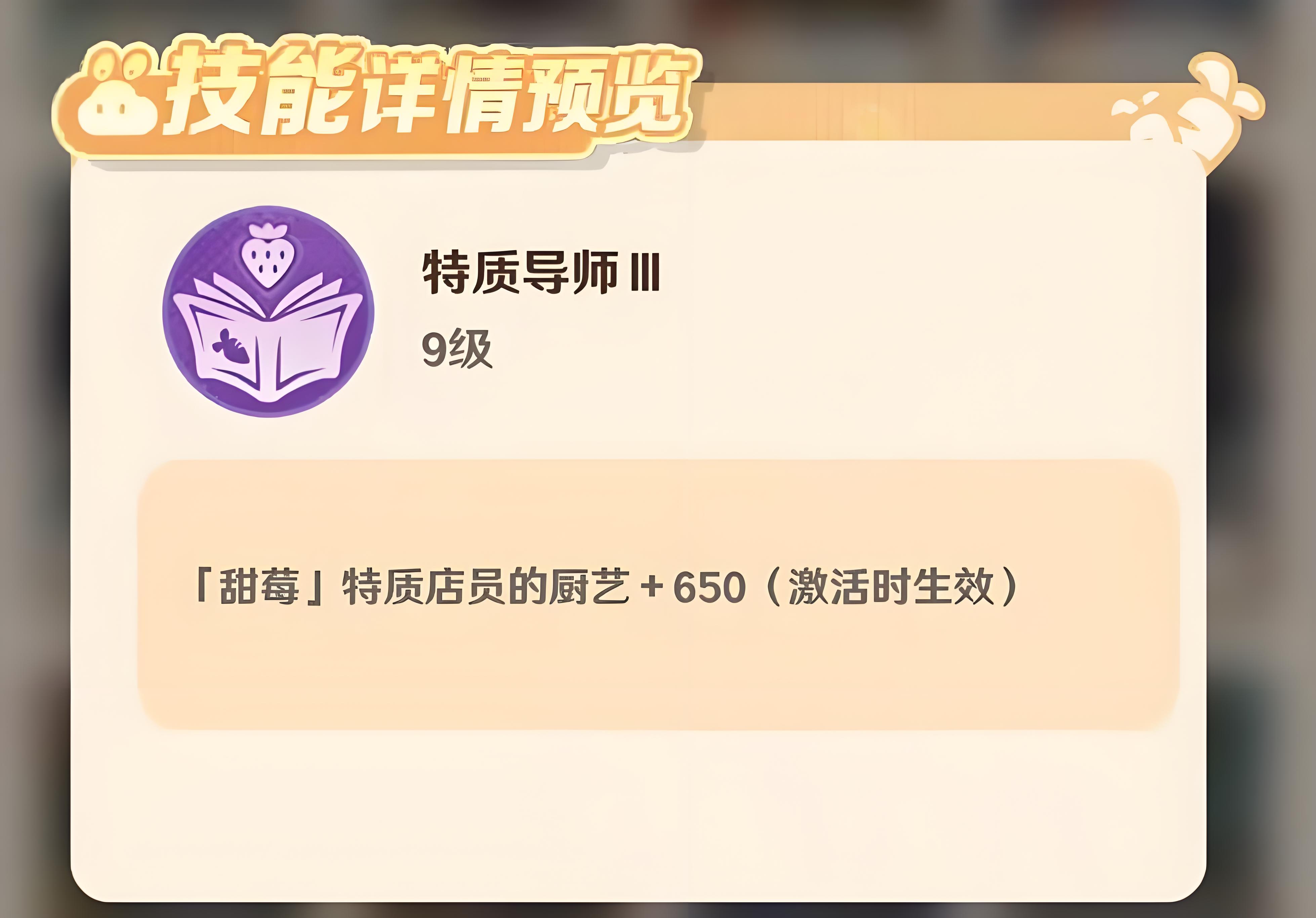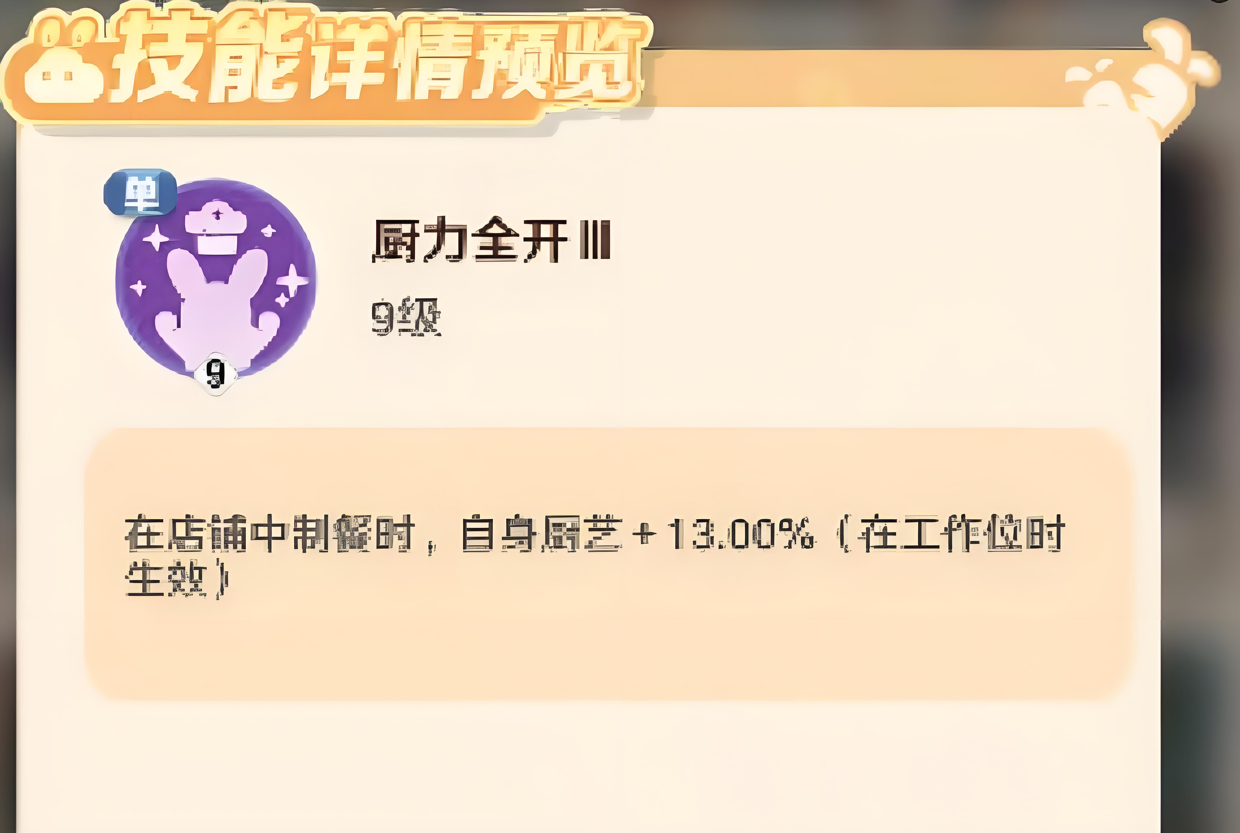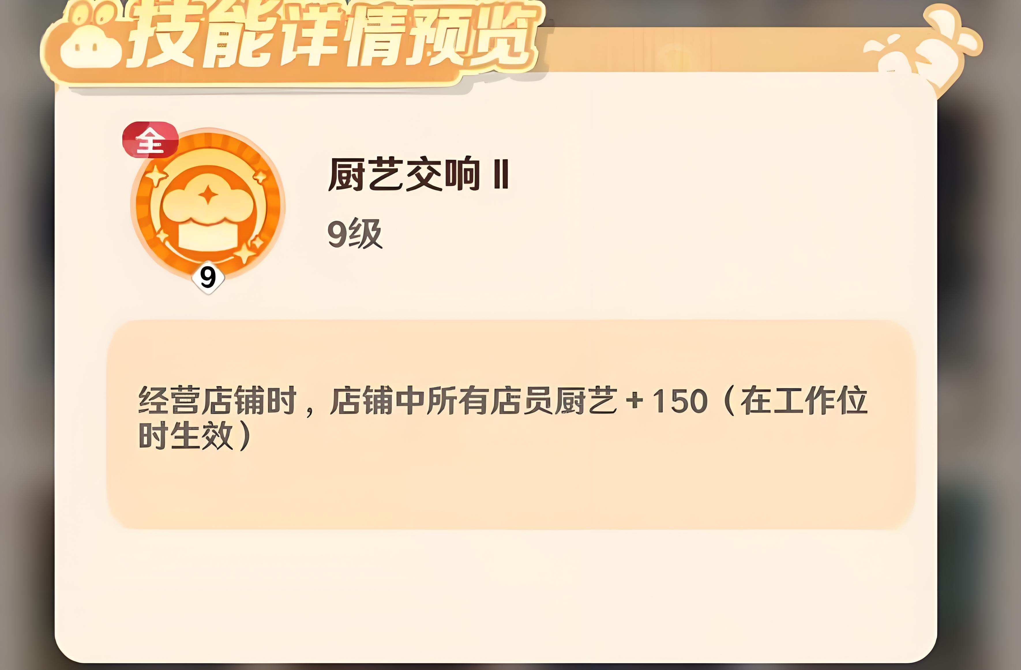 3、皮皮置餐時自身廚藝會提升實現(xiàn)持續(xù)進步,專屬技能廚藝共鳴能為所有店員提供屬性加成,帶動整個廚房團隊烹飪水平上升。