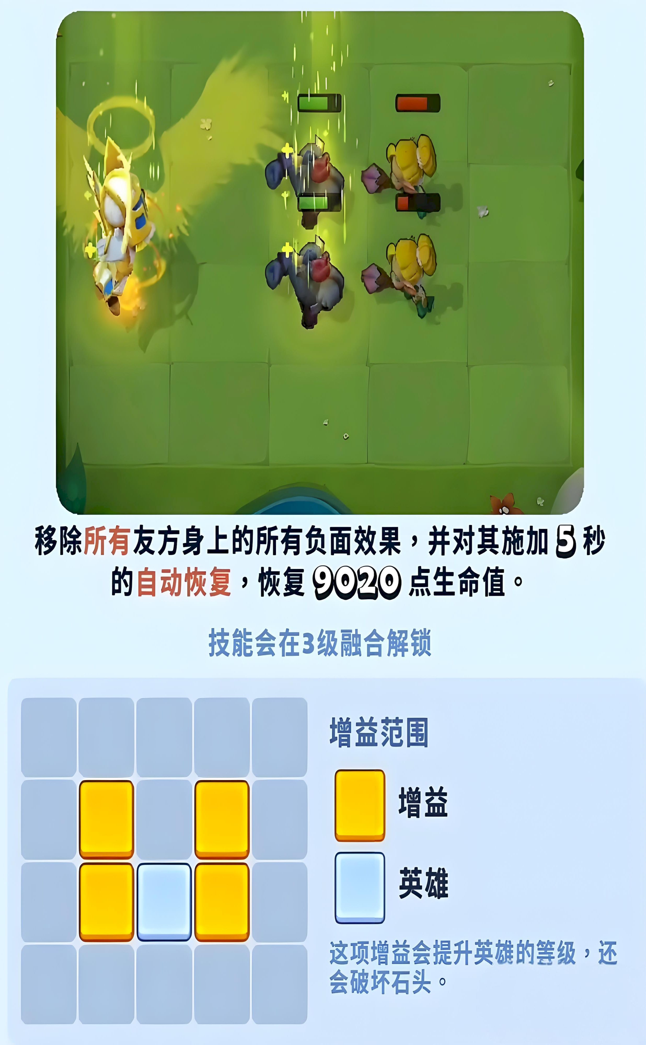 2、核心技能3級融合后解鎖技能釋放時移除所有友方負(fù)面效果,還為全體隊友施加5秒自動恢復(fù)共恢復(fù)9020點生命值,對抗持續(xù)傷害對手時很實用。
