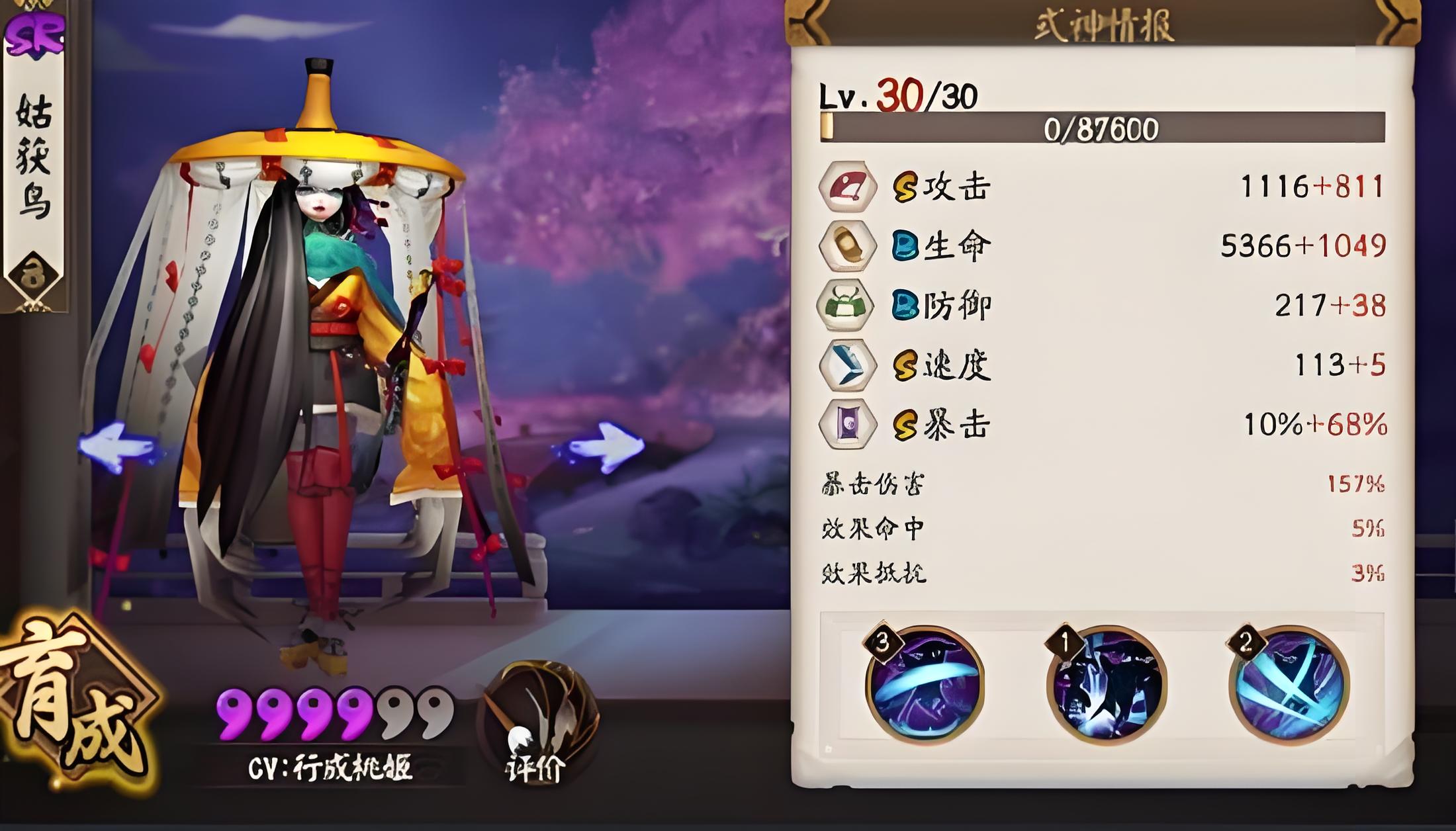 4、二號(hào)位速度屬性讓姑獲鳥在PVP和PVE中都能搶先出手,便于順利用魂火釋放必殺技,四號(hào)位攻擊百分比后期收益隨式神等級(jí)提升更明顯。
