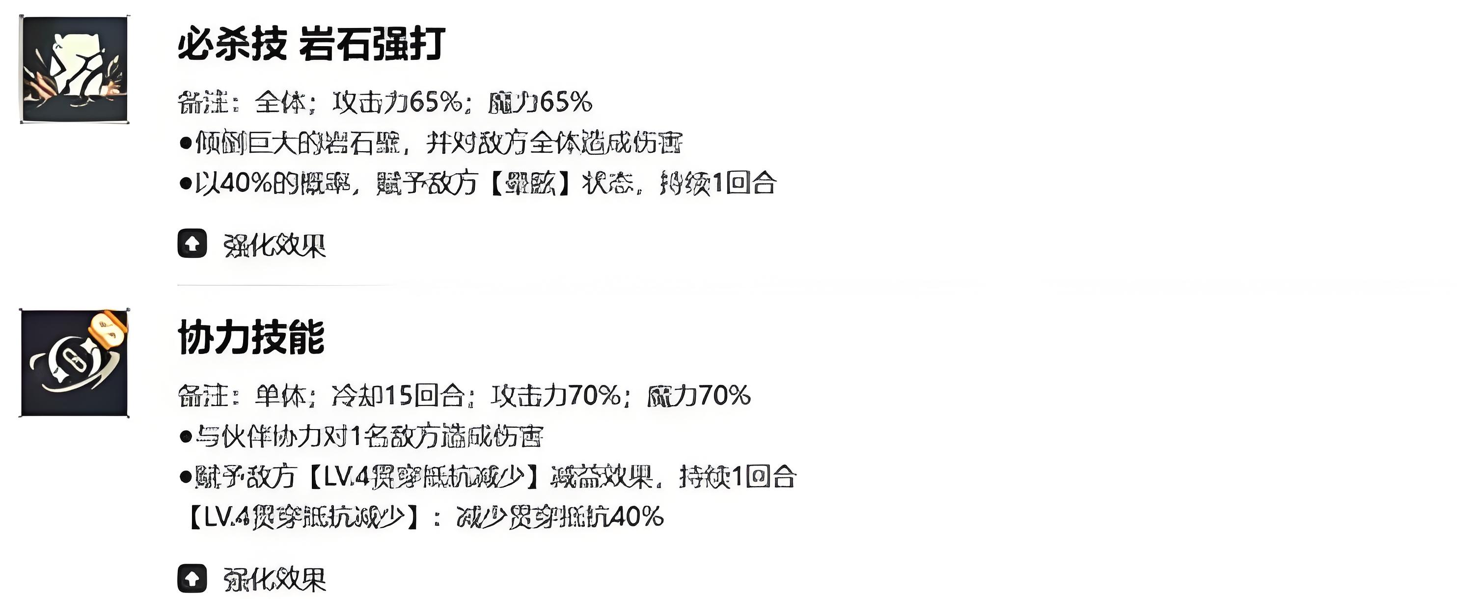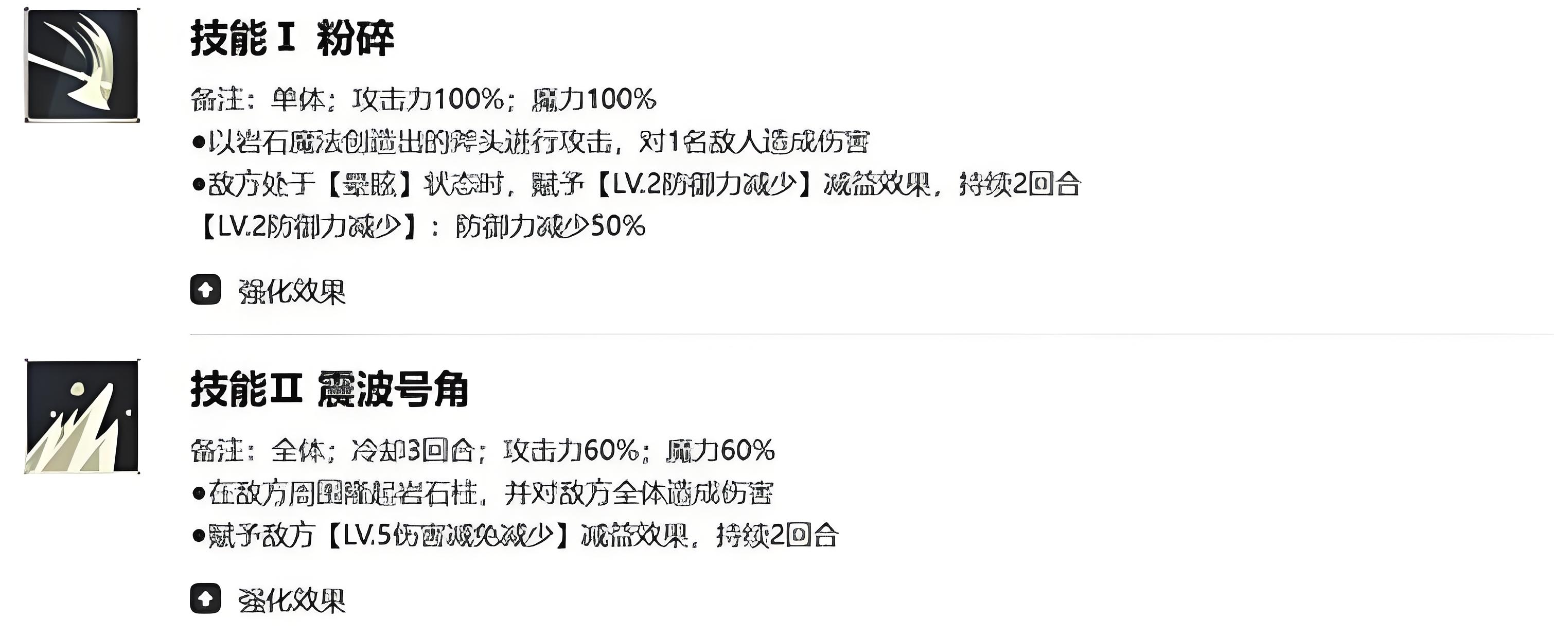 2、她的技能各有特點,粉碎對單體造巖石傷害且敵方暈眩時附加防御降低,震波號角對全體造傷害并減傷害減免,巖石強打群體傷害且有概率致暈眩。