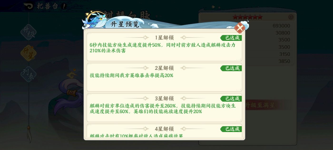 3、麒麟升星效果不同,1星提技能速度并造傷害,2星提隊(duì)友暴擊率,3星增傷害與技能速度,4星攻擊有概率讓敵人麻痹。
