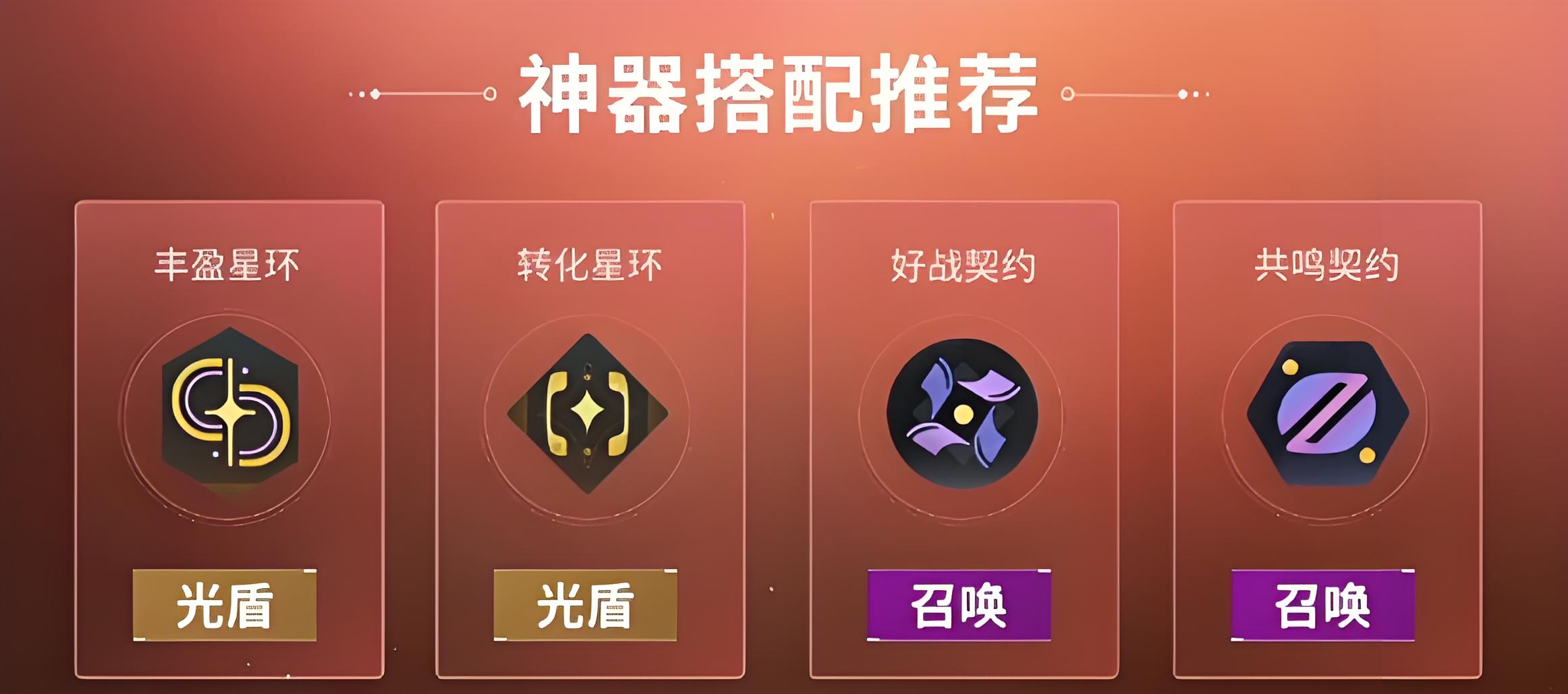 5、神器推薦豐盈星環(huán)轉(zhuǎn)化星環(huán)好戰(zhàn)契約共鳴契約,這些神器可從不同維度強化召喚能力,提升埃斯黛拉整體戰(zhàn)力。
