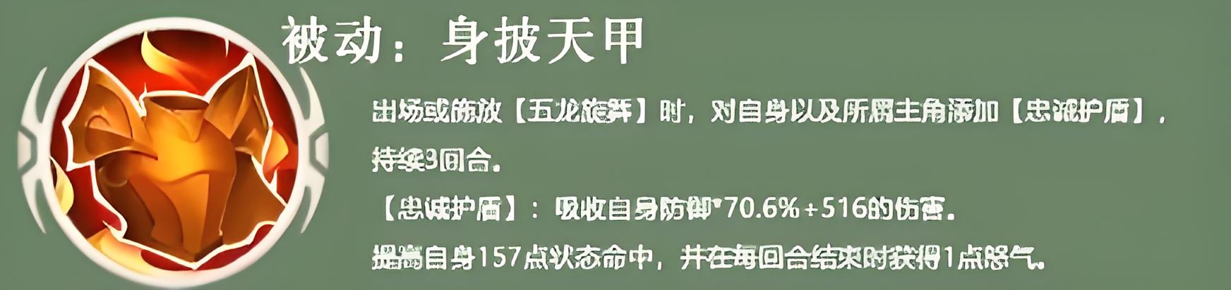 3、被動身披天甲出場或釋放絕技時,給自身及主角加忠誠護(hù)盾持續(xù)回合,護(hù)盾吸收傷害并提升狀態(tài)命中每回合結(jié)束獲得怒氣。