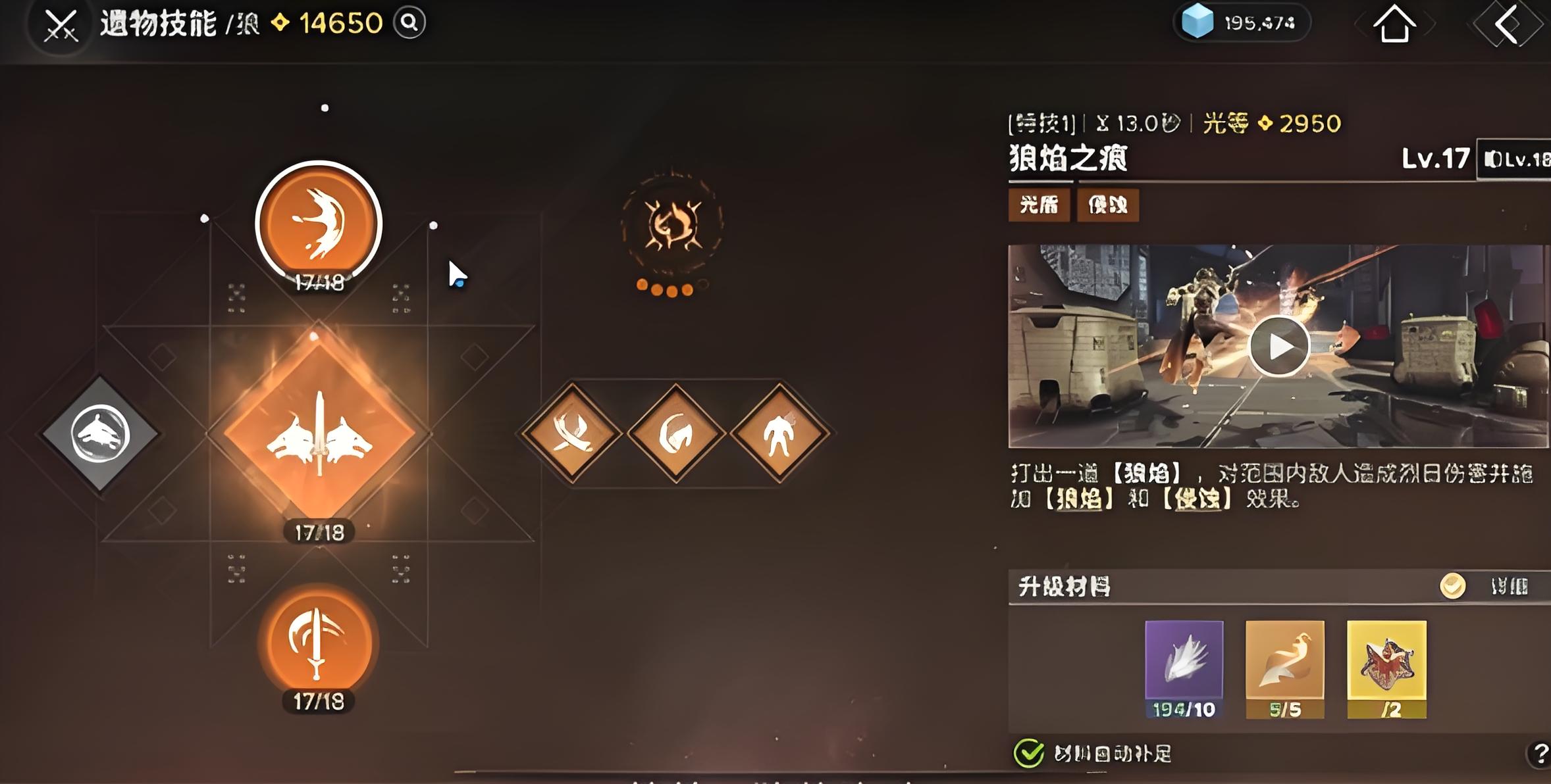 2、特技1狼焰之痕能打出狼焰,對(duì)范圍內(nèi)敵人造成烈日傷害,還會(huì)施加狼焰和侵蝕效果,為后續(xù)攻擊鋪墊。