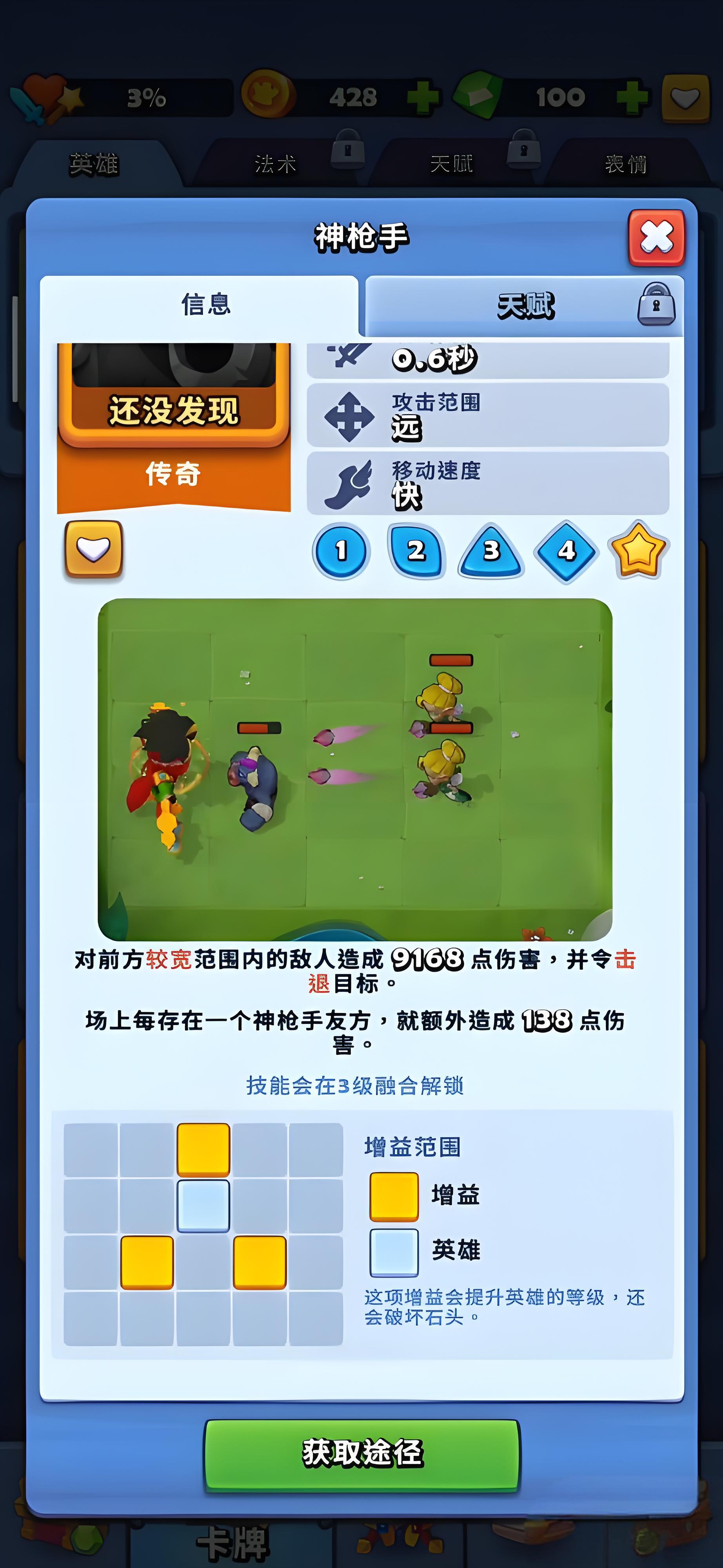 1、神槍手基礎(chǔ)屬性亮眼,生命值64829、傷害2160,攻擊間隔僅0點6秒屬高攻速卡牌,移動速度快,自動戰(zhàn)斗中能靈活調(diào)整目標(biāo)保持火力輸出。
