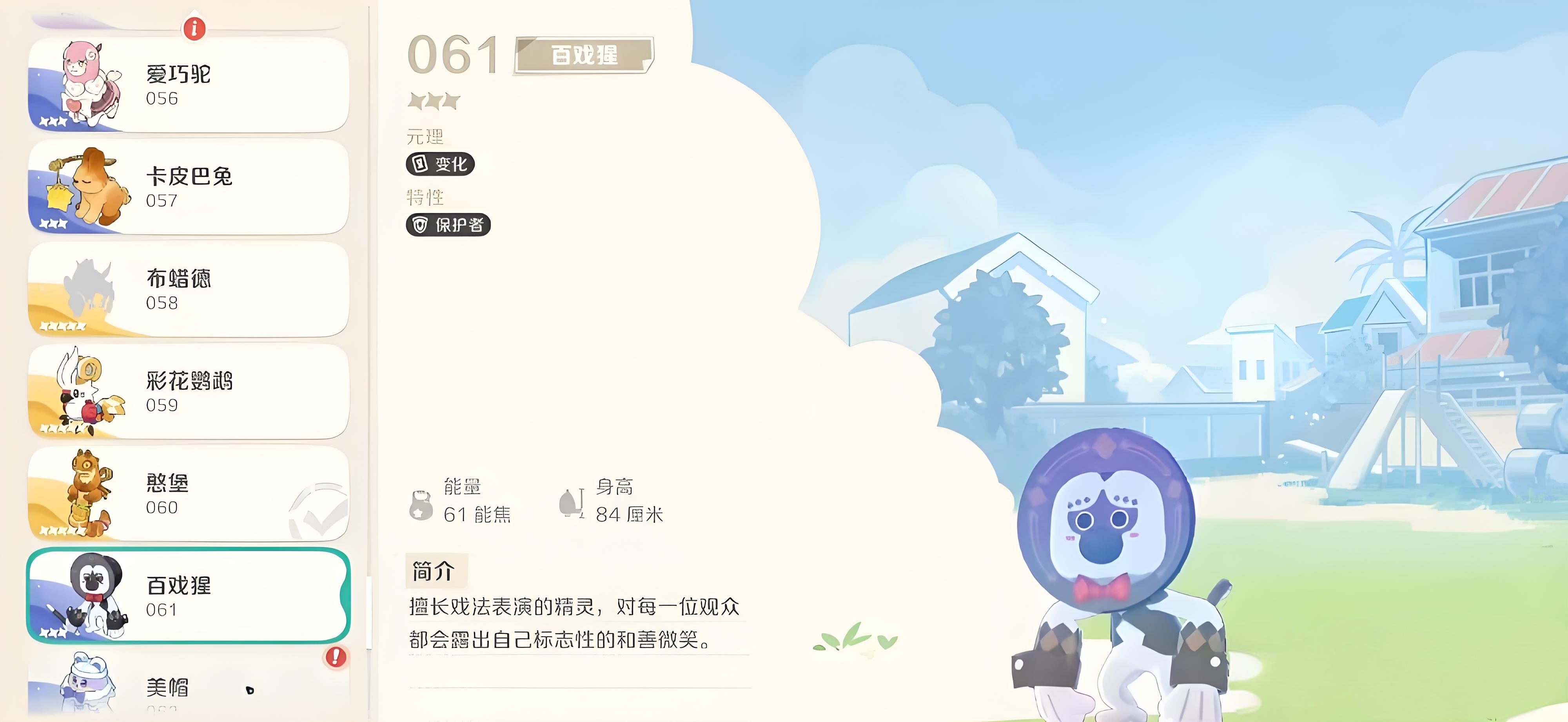 1、百戲猩定位前排承傷精靈,主打魔法傷害輸出,元理歸屬變化類別、特性為保護(hù)者,符合前排肉盾常見定位,能在前排為隊友吸收傷害。