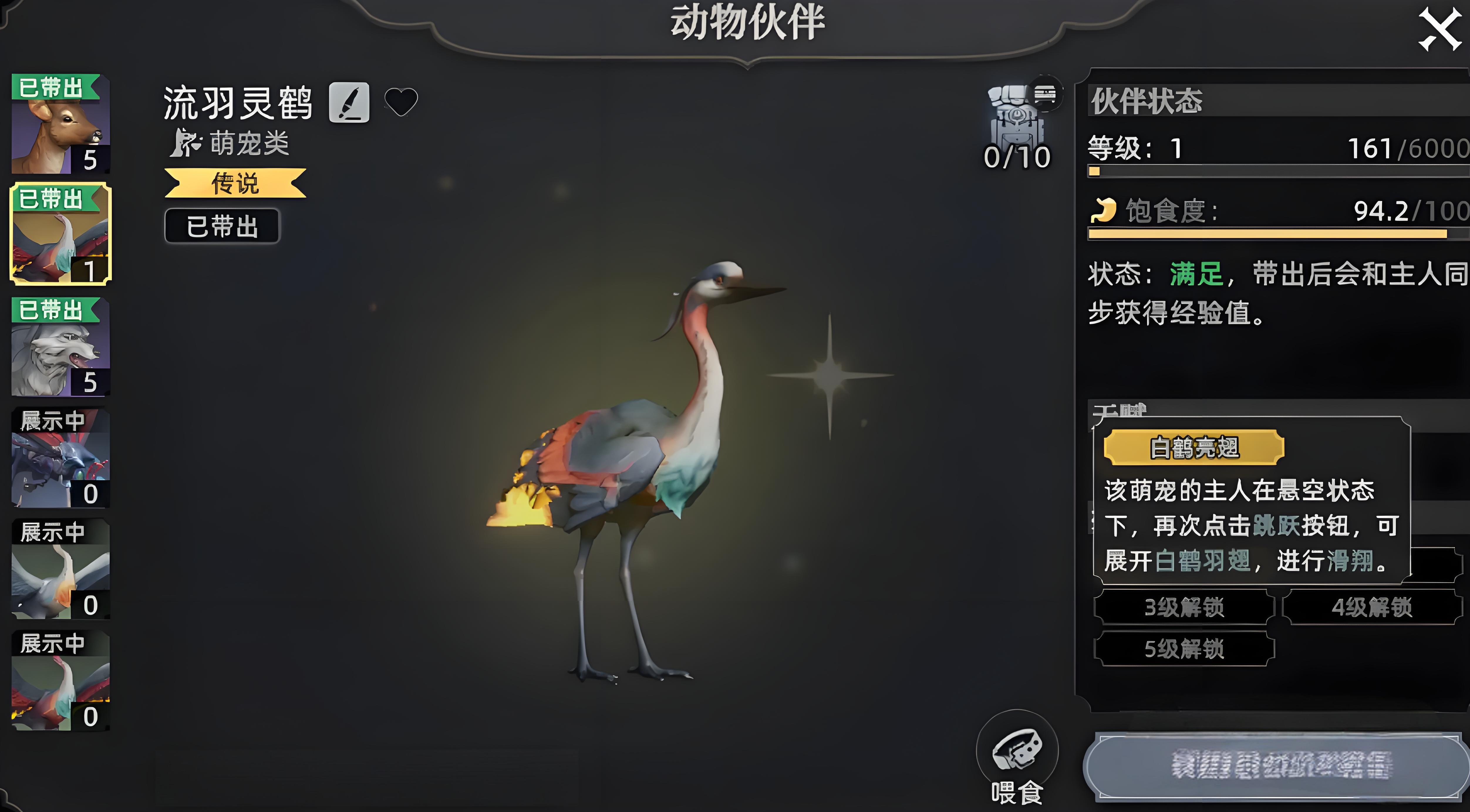 4、光鶴3級解鎖白鶴亮翅技能,主人懸空時(shí)點(diǎn)擊跳躍可展開羽翅滑翔,能減輕探索壓力是前期提升移動(dòng)效率的重要伙伴。