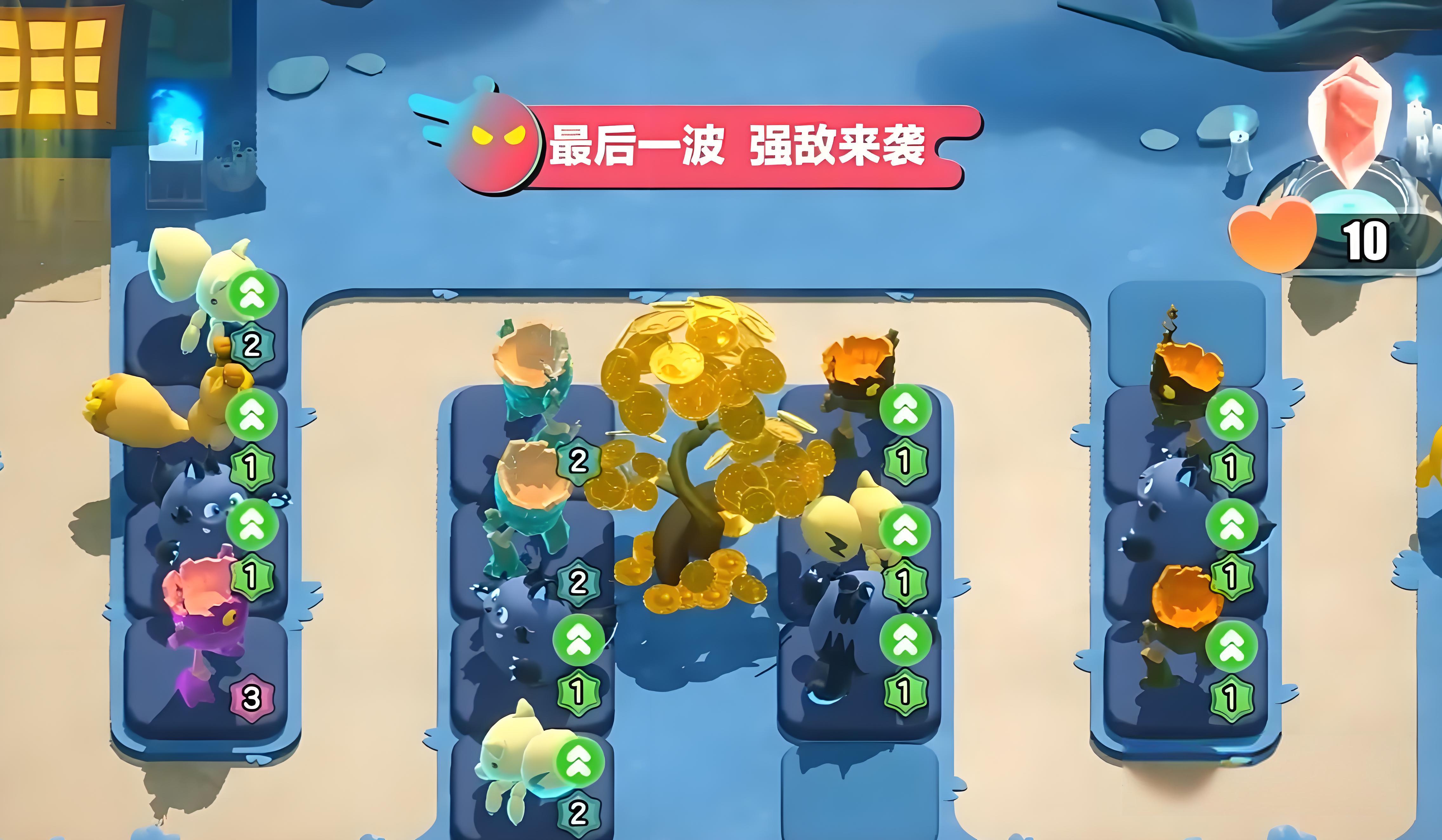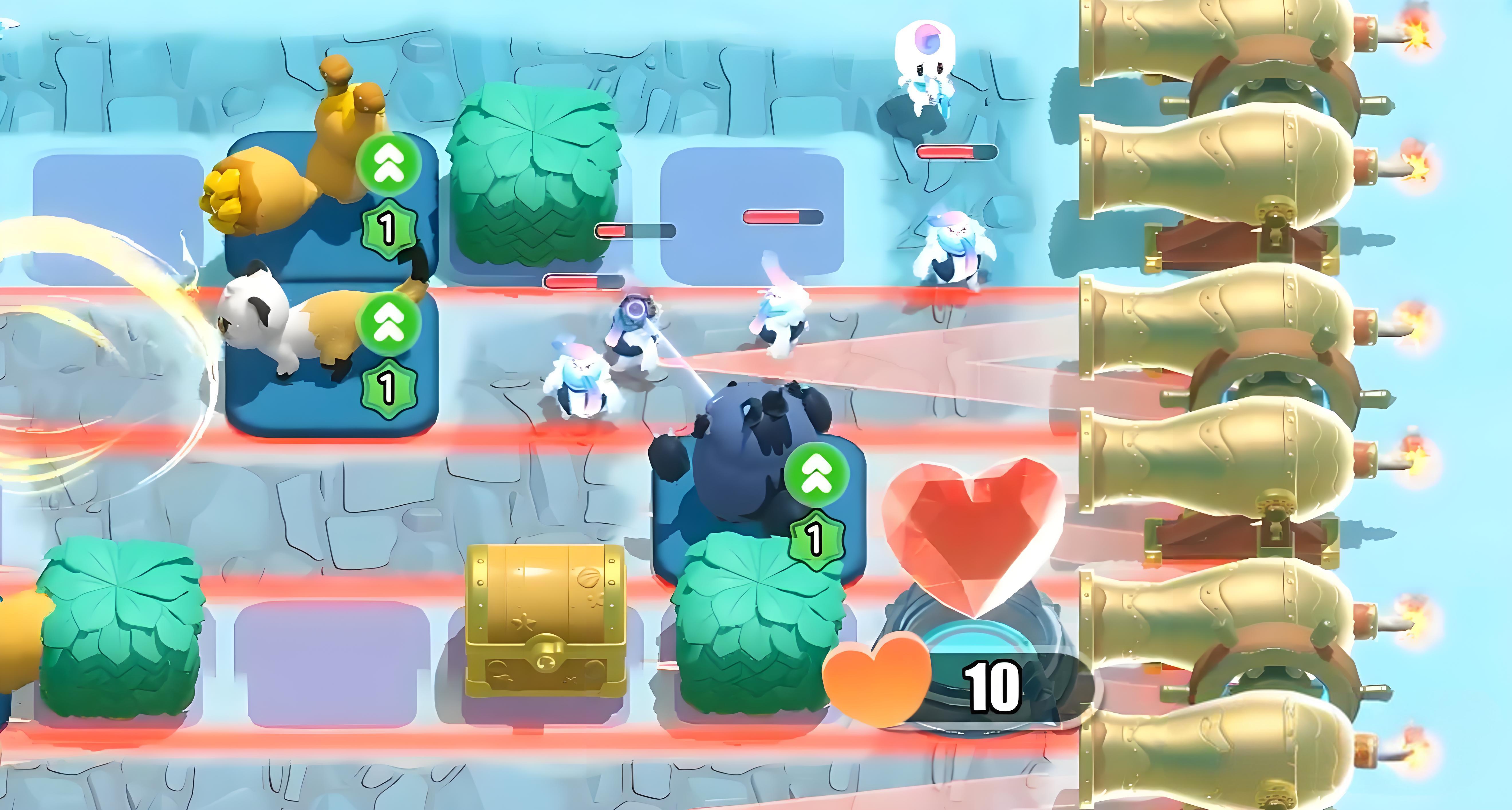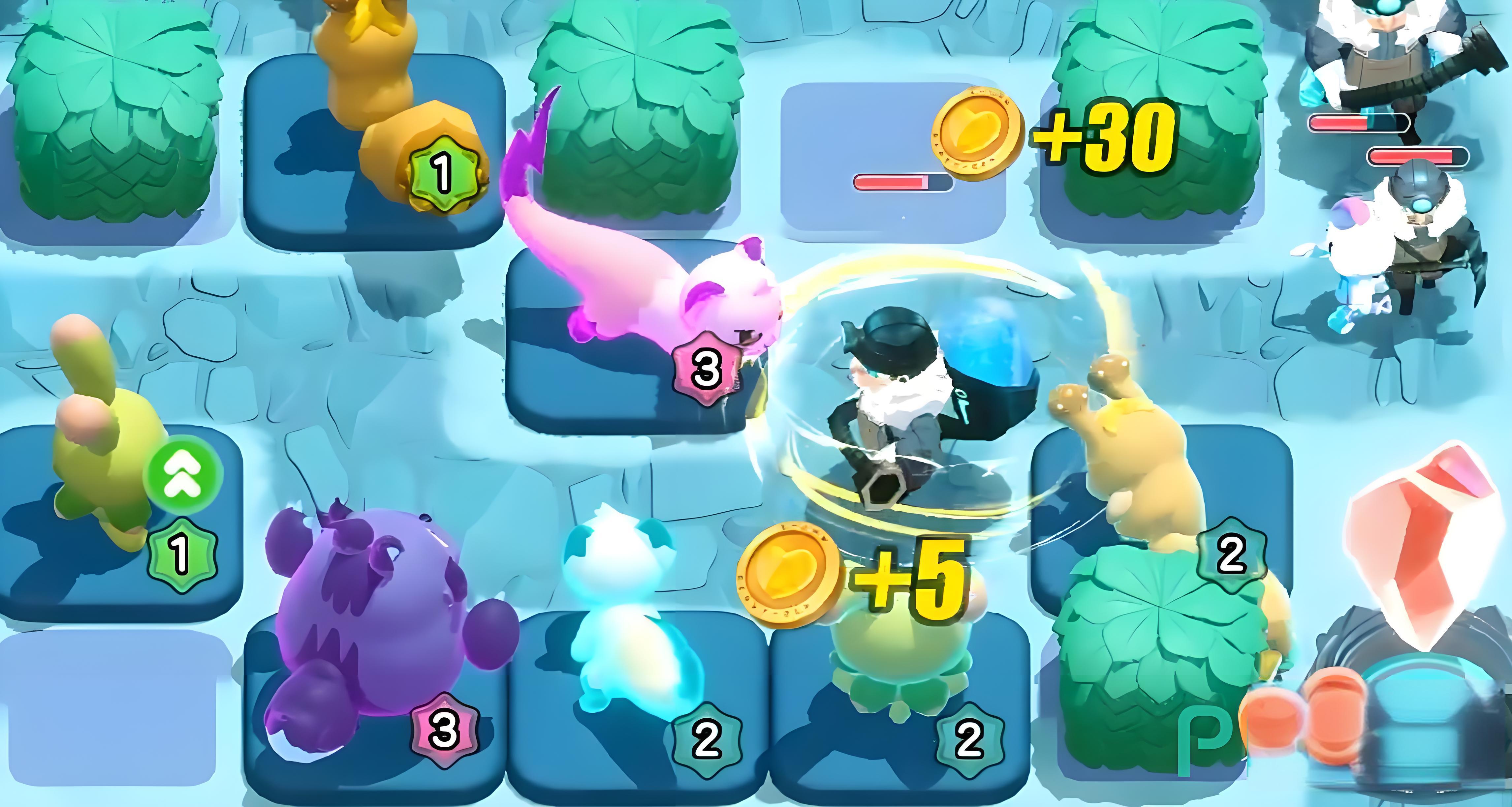 3、正式對局中怪物從傳送門進(jìn)入地圖,每關(guān)需攻擊指定數(shù)量怪物,玩家依地形布置艾比或用技能,解鎖障礙物和寶箱獲取金幣與塔基。