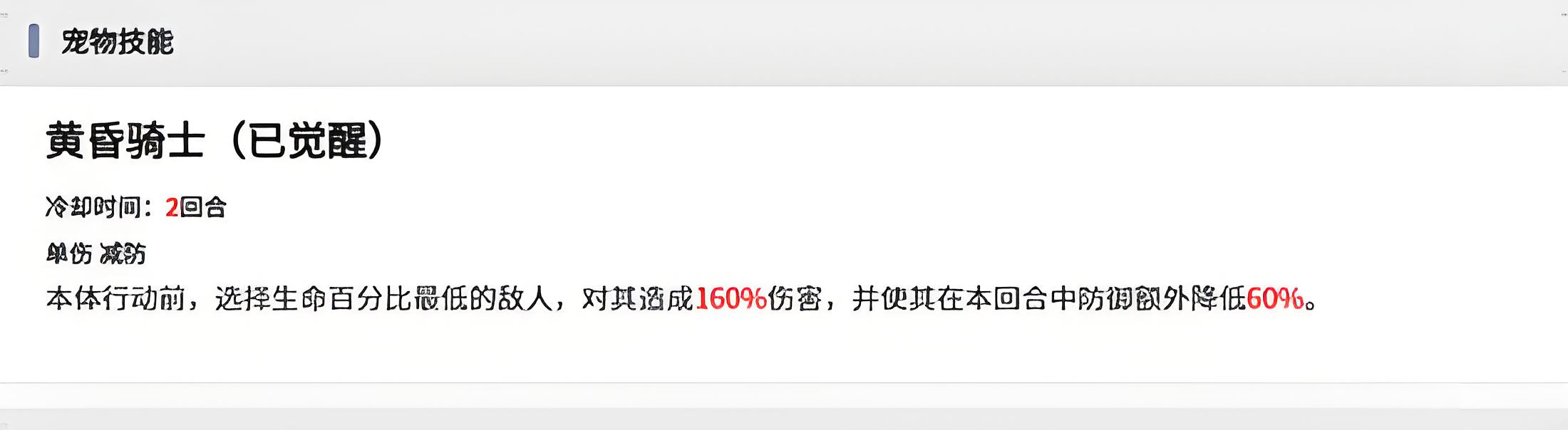 3、覺醒寵物技能冷卻2回合,行動前選殘血敵造160%傷害,本回合降防60%,兼具破防與殘血收割能力。