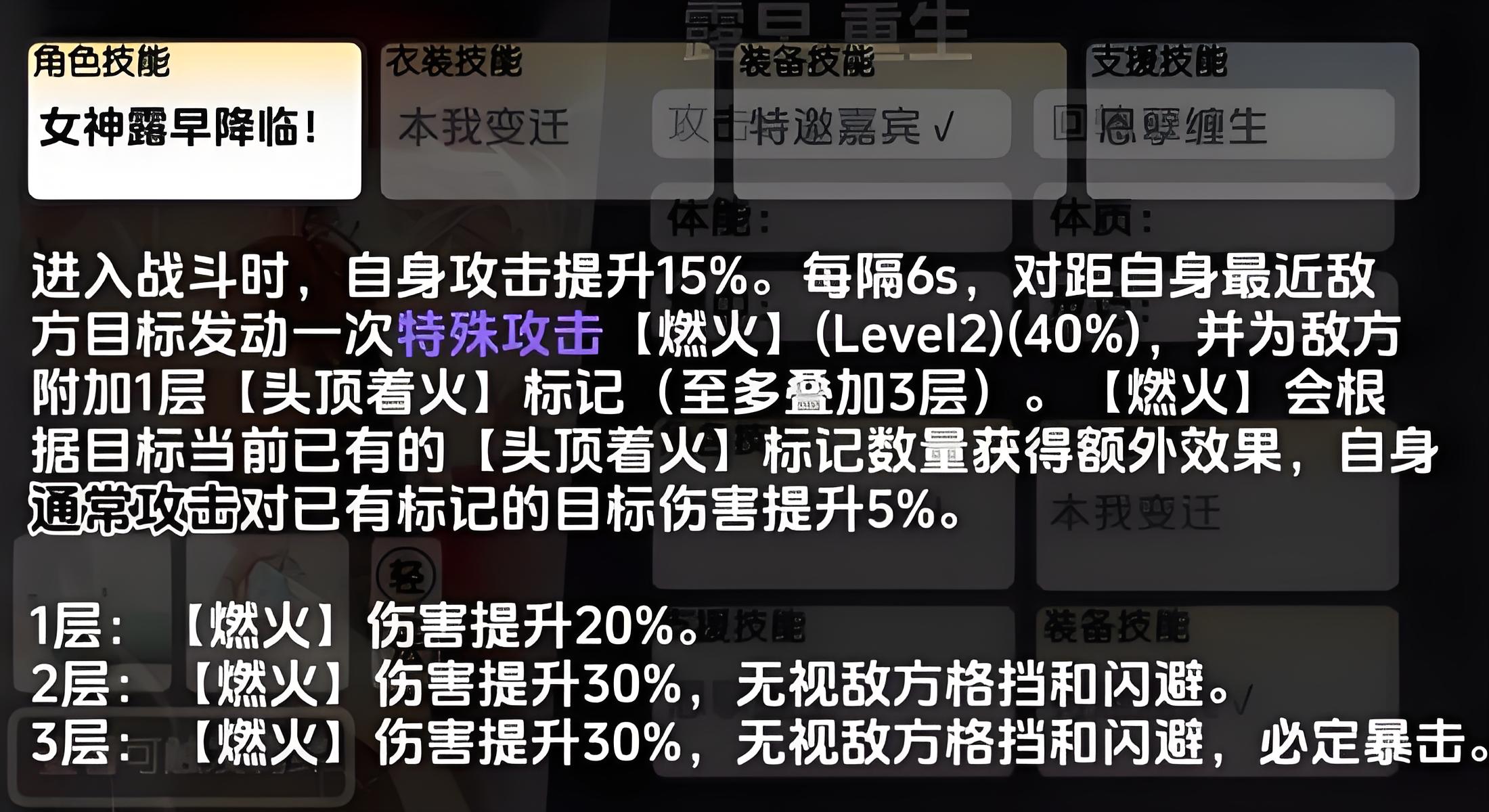 2、主動技能開局提升自身15%攻擊,每6秒對最近敵人發(fā)動燃火并附加標記,三層標記時燃火必定暴擊,大幅提升爆發(fā)能力。