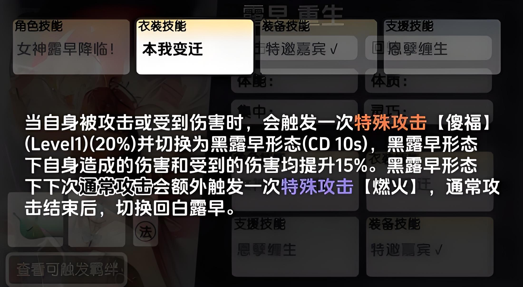 3、衣裝技能受攻擊或造成傷害時觸發(fā)傻福攻擊,切換黑露早形態(tài)持續(xù)10秒,此形態(tài)傷害與受傷害均提15%,普攻額外觸發(fā)燃火。