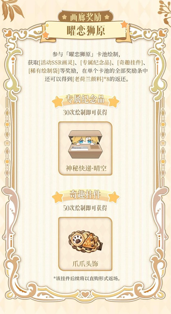 1、活動畫廊戀戀奇蹤曜戀獅原限時開啟,參與卡池繪制可獲取活動SSR畫靈、神秘快遞、奇趣掛件等物品,單個卡池領(lǐng)取完全部獎勵條還返老荷蘭顏料。