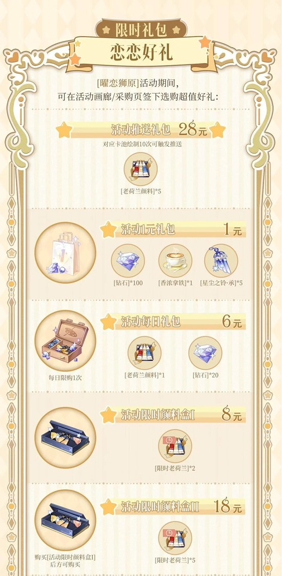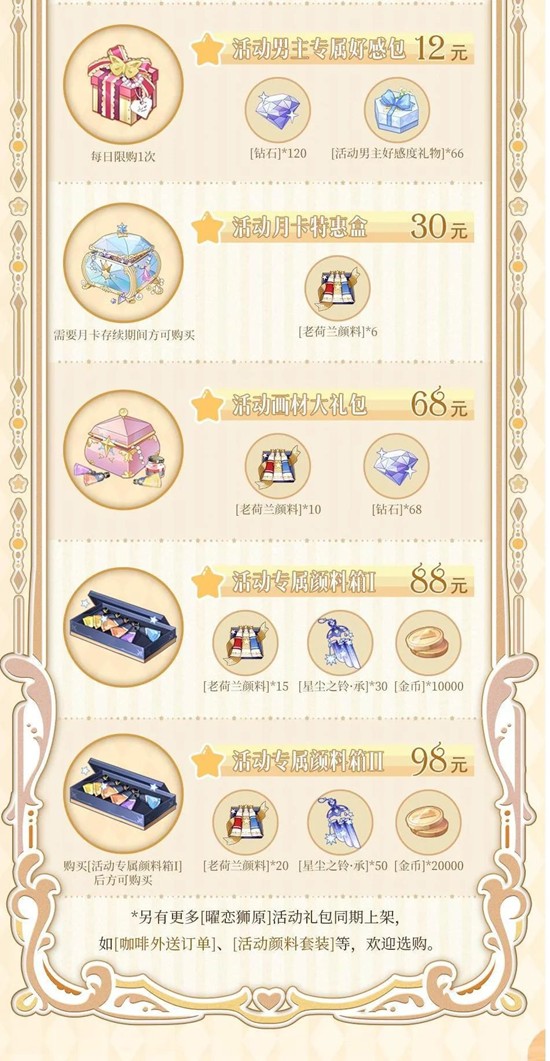 4、活動還包含不同價位的限時顏料盒、每日禮包、男主專屬好感包等,部分禮包需先購買前置禮包或滿足月卡存續(xù)狀態(tài)這兩個條件中的一個才能購買。