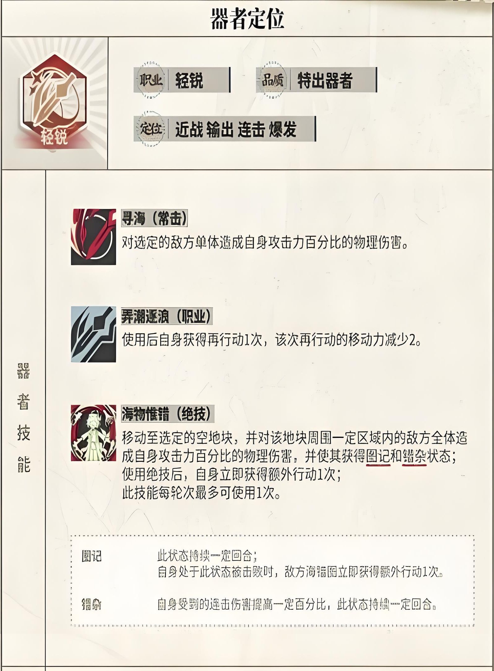 1、常擊對選定敵方單體造成攻擊力百分比物理傷害,職業(yè)技能使用后自身獲得再行動1次,該次再行動過程中移動力減少2。