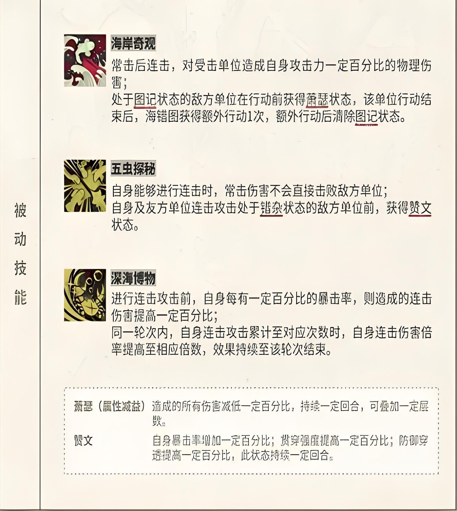 3、被動一讓常擊后觸發(fā)連擊,對受擊單位額外造成攻擊力百分比物理傷害,圖記狀態(tài)下敵方行動前會獲得蕭瑟狀態(tài)。