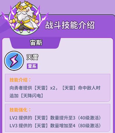 1、宙斯天雷技能為勇者提供天雷,命中敵人后追加天降閃電,隨著等級提升可增加天雷數(shù)量,強(qiáng)化輸出頻率與覆蓋范圍。