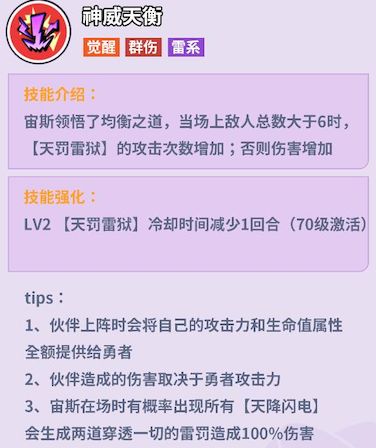5、宙斯實(shí)戰(zhàn)有三點(diǎn)關(guān)鍵提示,上陣時為勇者提供全額攻防屬性,傷害依賴勇者攻擊力,特定情況下天降閃電會生成穿透雷罰。