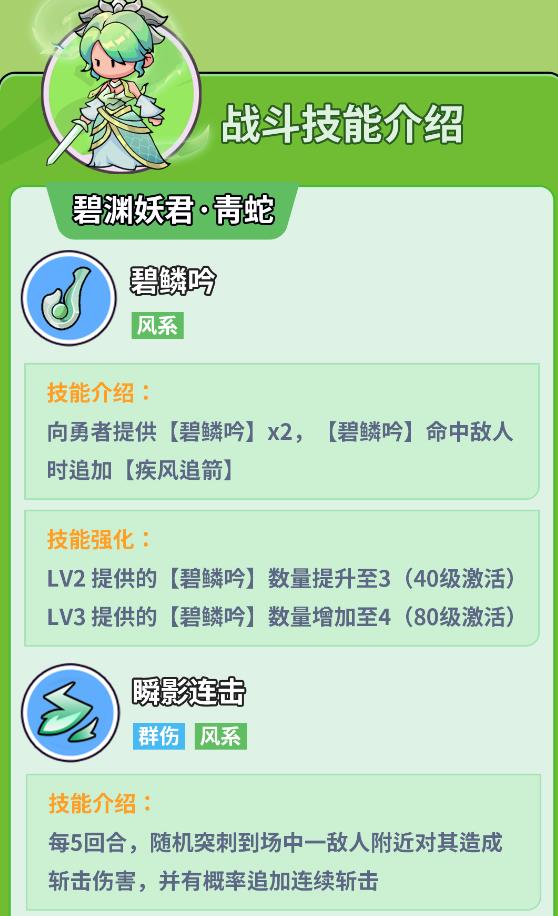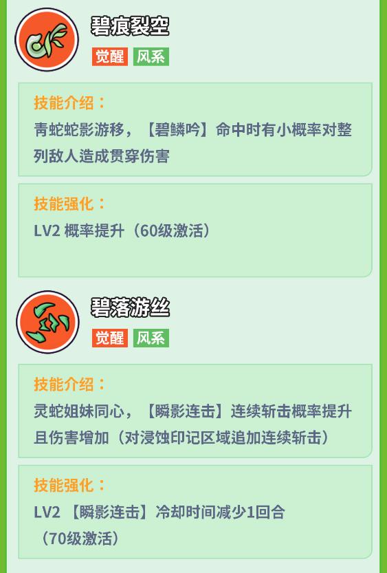 1、青蛇擁有碧鱗吟瞬影連擊碧痕裂空碧落游絲四個風系技能,不同技能有各自核心效果,且隨等級提升會得到強化,比如碧鱗吟等級提升后提供數(shù)量會增加。
