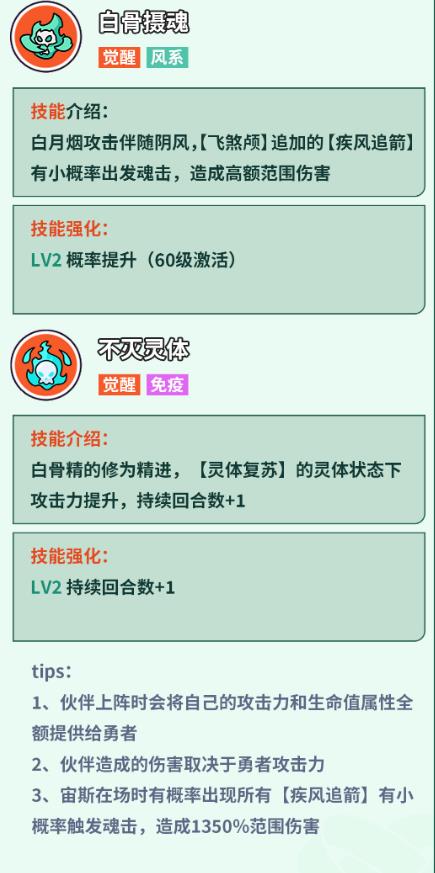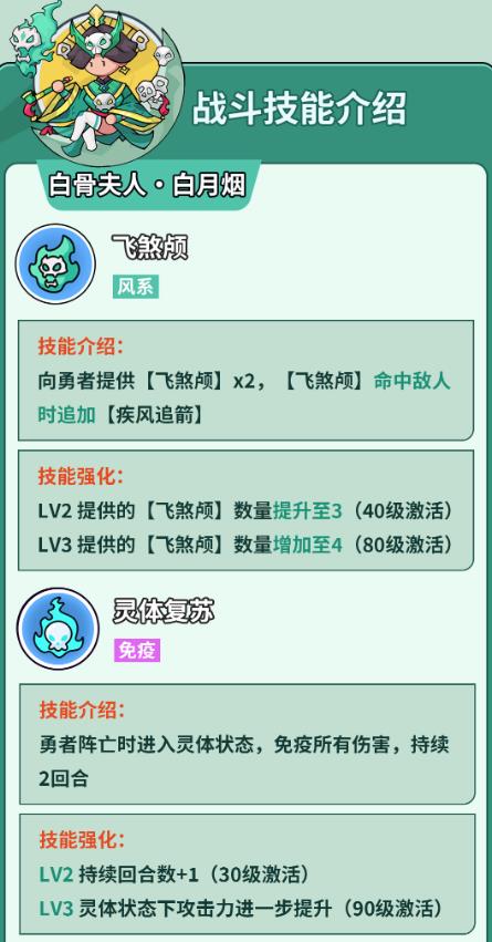 1、白月煙核心技能飛煞顱,能向勇者提供飛煞顱,命中敵人追加疾風(fēng)追箭,隨著等級提升可增加數(shù)量,是她的主要輸出手段。