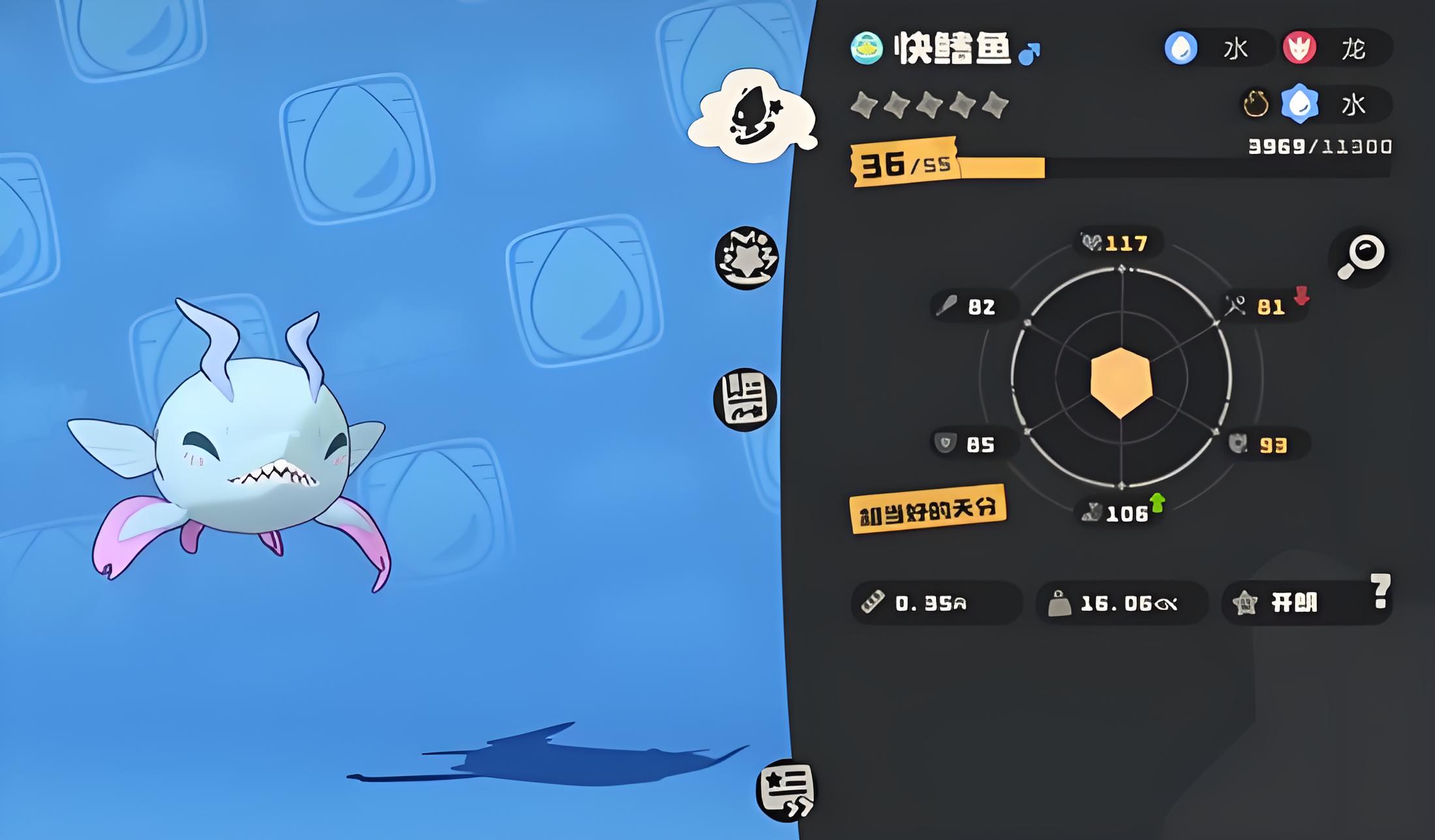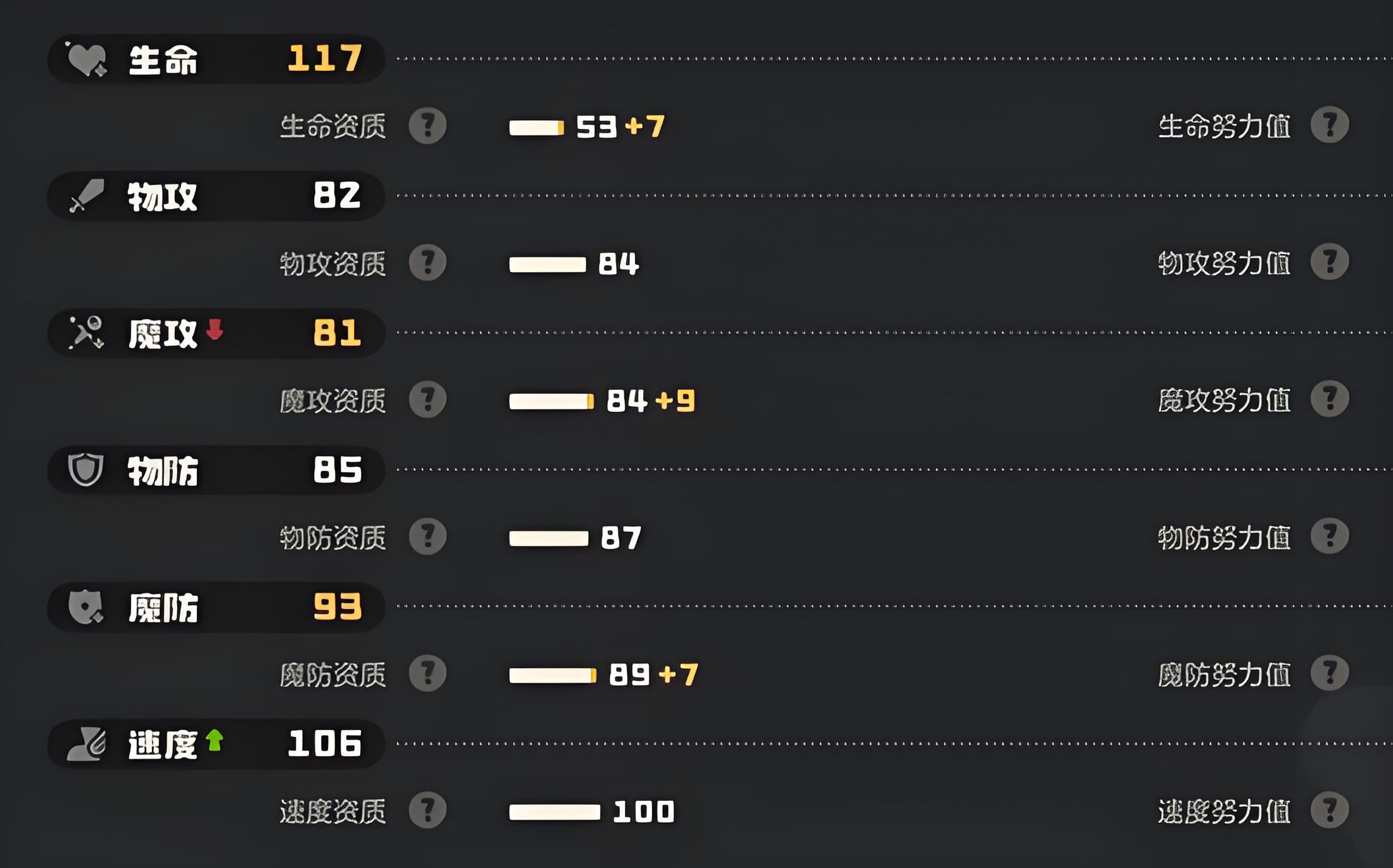 2、定位高速輸出型水系精靈,速度屬性在同等級精靈中處于領先,物理與魔法攻擊雙維度成長較好,生命值相對偏低,適合擔任突擊手角色。