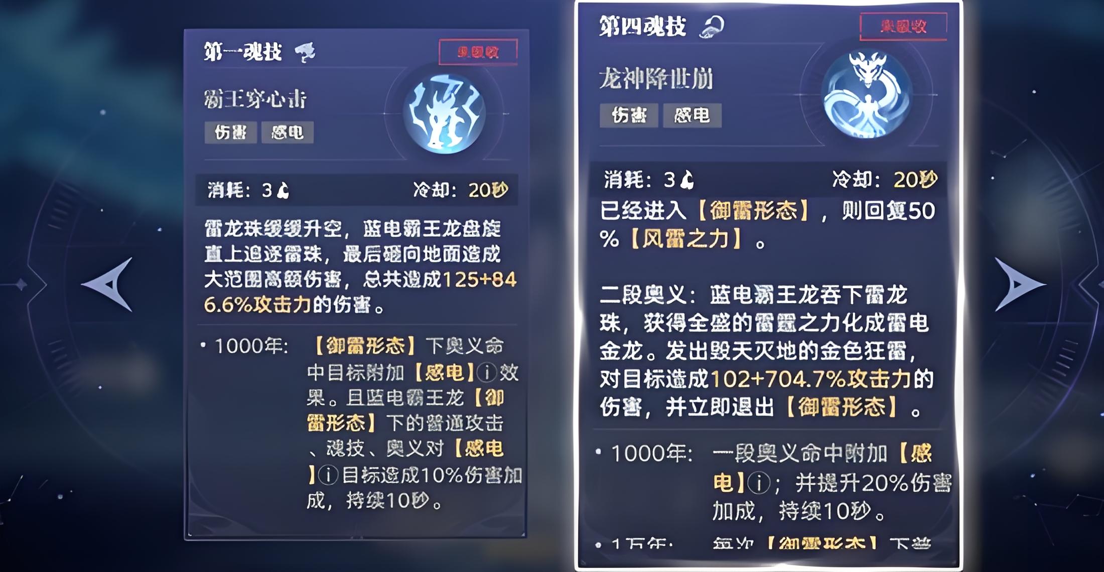 3、第二魂技提供范圍高額傷害,配合普攻與技能快速觸發(fā),第四魂技兩段爆發(fā)且回復(fù)風(fēng)雷之力,保障技能循環(huán)持續(xù)。