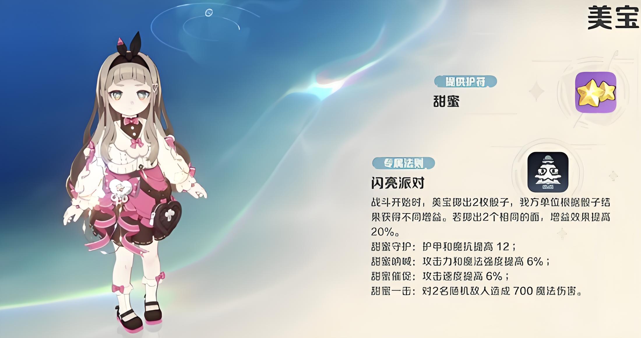 2、甜蜜守護為全體隊友附加護甲,提升魔法抗性,強化前排單位生存能力,對抗法術(shù)輸出陣容時作用顯著,適配持久戰(zhàn)體系。