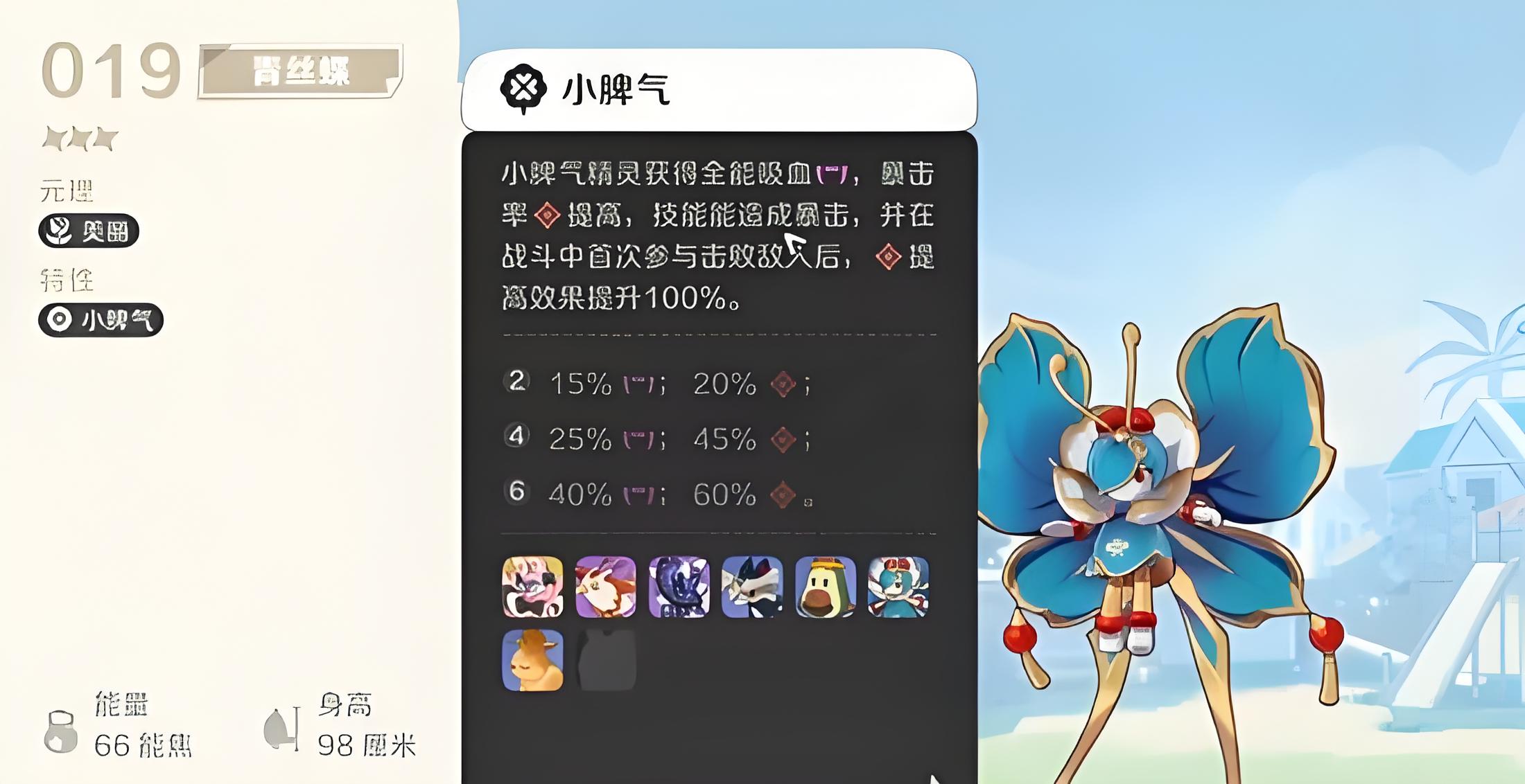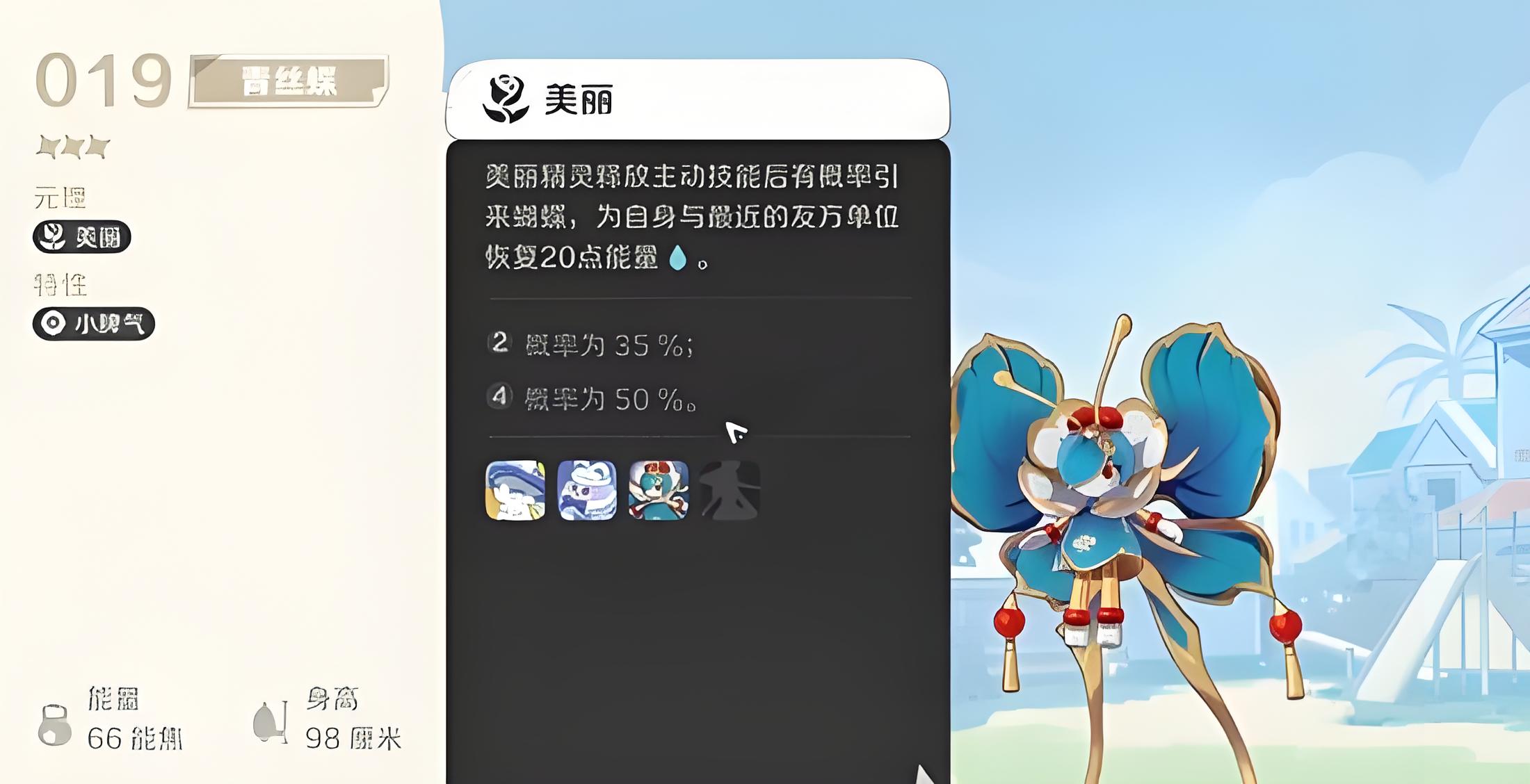 2、技能釋放有概率召喚蝴蝶,為自身或周圍友方恢復(fù)20點(diǎn)能量,觸發(fā)概率最高達(dá)50%,加快全隊大招循環(huán)適配依賴技能輸出的陣容。