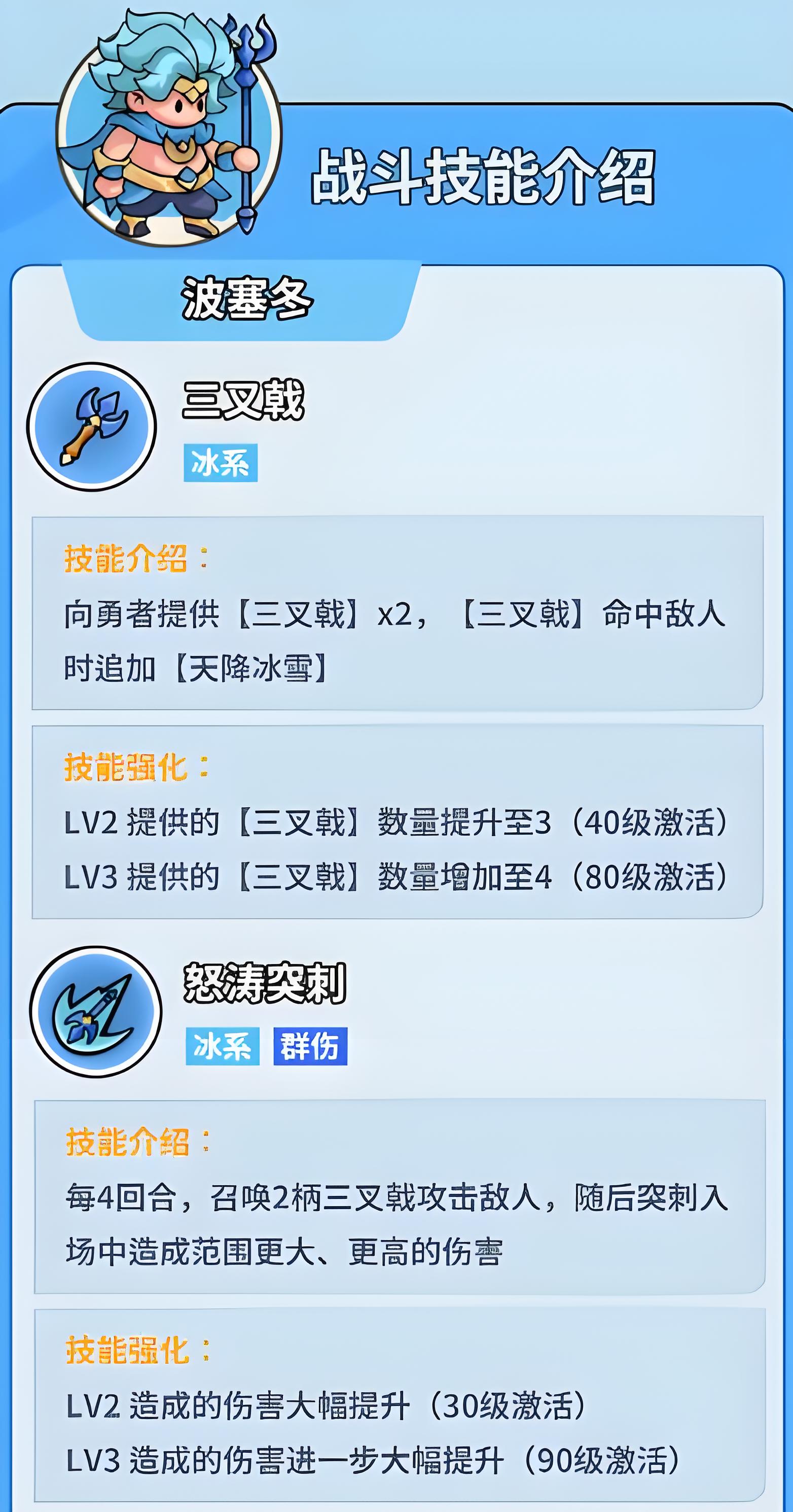 2、核心技能三叉戟初始提供兩柄,命中敵人追加天降冰雪,40級解鎖二級強(qiáng)化增至三柄,80級三級強(qiáng)化進(jìn)一步提升至四柄。