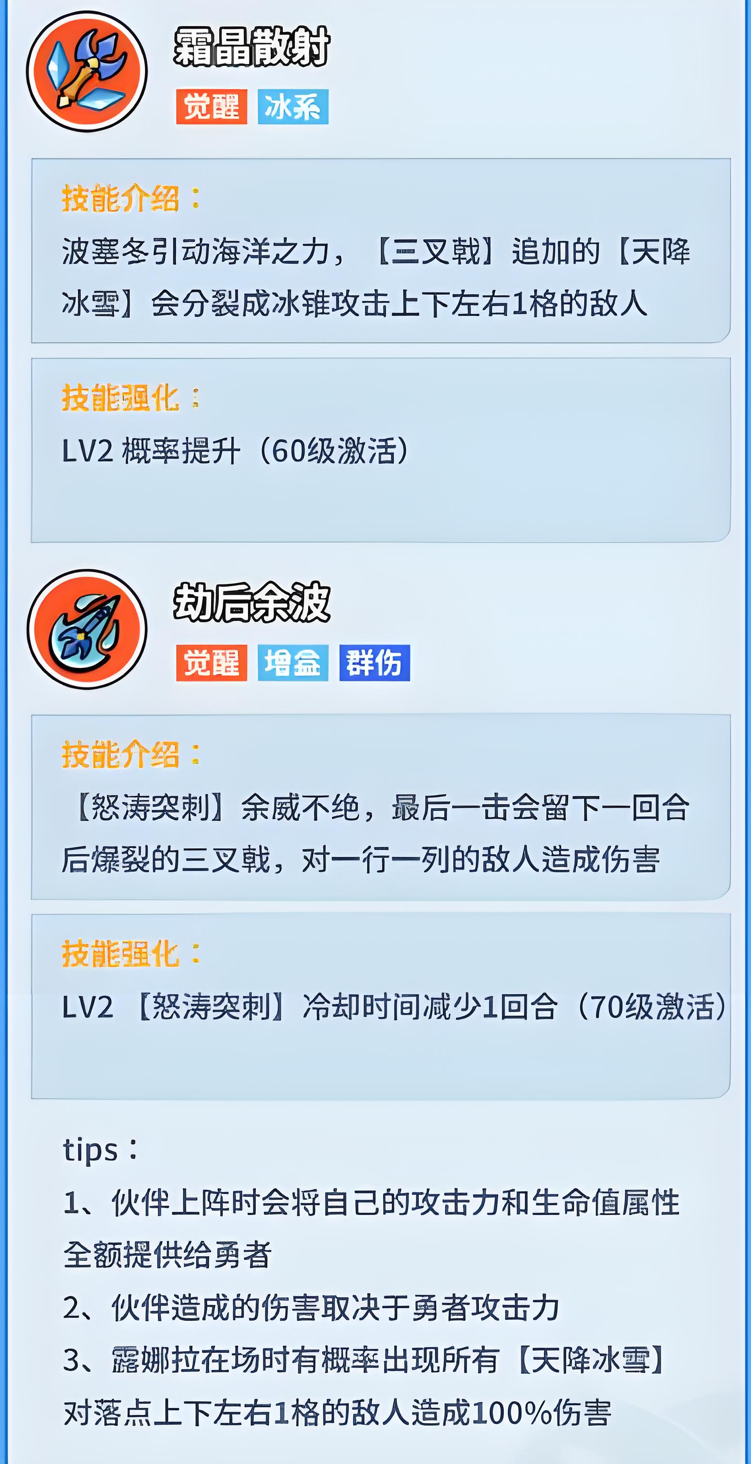 4、覺醒技能霜晶散射能讓天降冰雪分裂為冰錐,攻擊目標(biāo)上下左右一格敵人,60級解鎖強(qiáng)化提升該技能觸發(fā)概率。