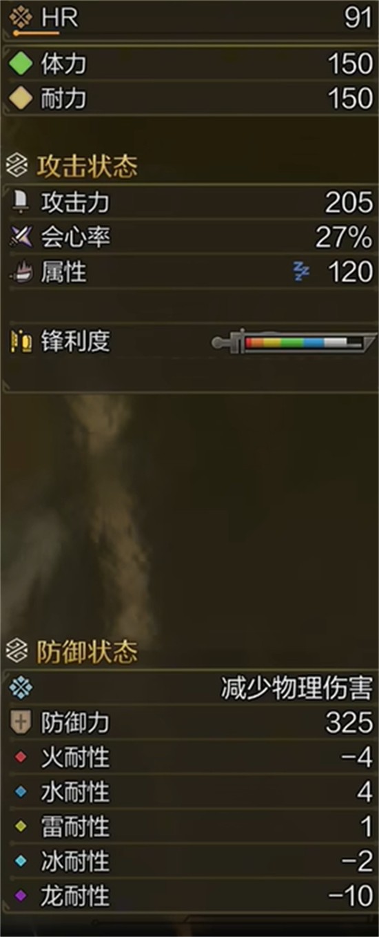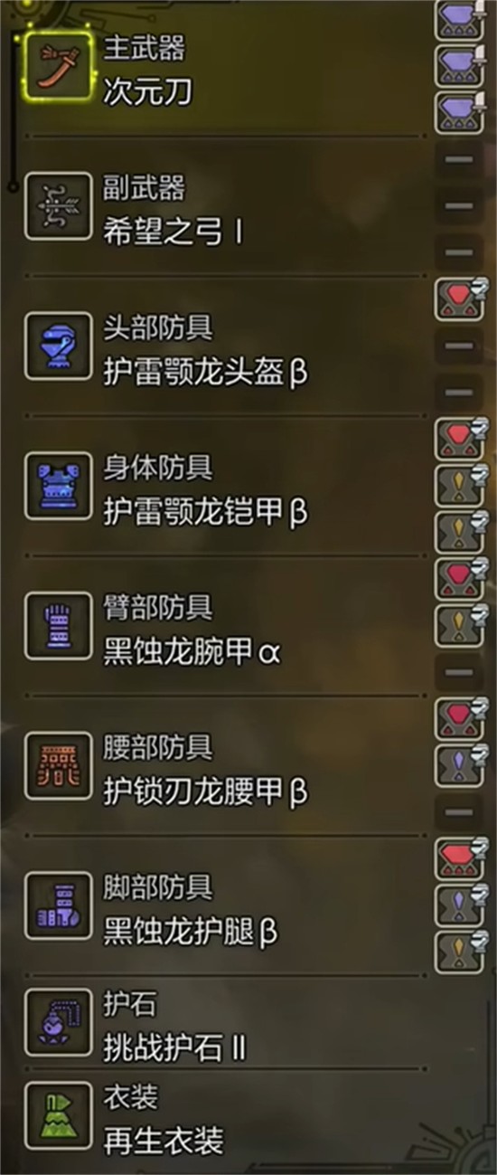1、主武器選用次元刀其自帶15至20點(diǎn)會(huì)心值,為后續(xù)堆疊會(huì)心率奠定基礎(chǔ),是該配裝的核心武器選擇。