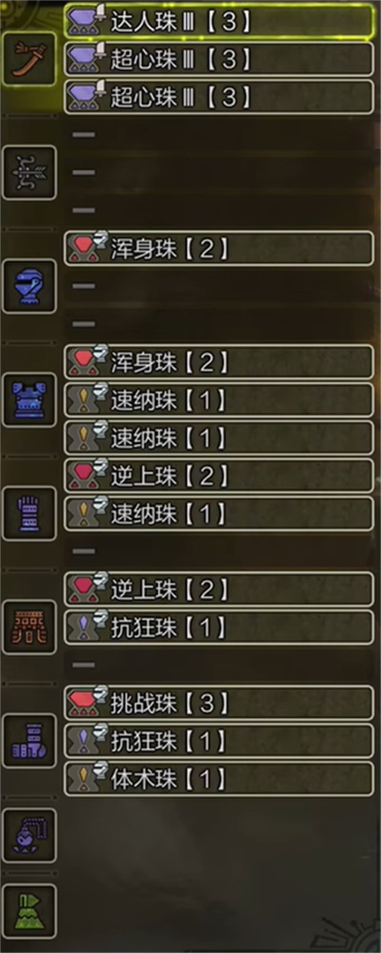 4、武器鑲嵌達(dá)人珠III超心珠II超心珠III,頭部渾身珠II胸部雙速納珠,臂部逆上珠II腰部抗狂珠I。