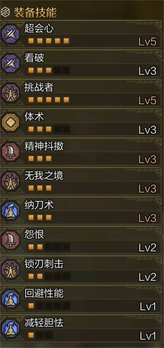 3、核心技能需達(dá)成挑戰(zhàn)者7級(jí)超會(huì)心3級(jí)達(dá)人藝3級(jí)看破3級(jí)逆境2級(jí),通過(guò)挑戰(zhàn)護(hù)石II補(bǔ)充所需技能點(diǎn)數(shù)。