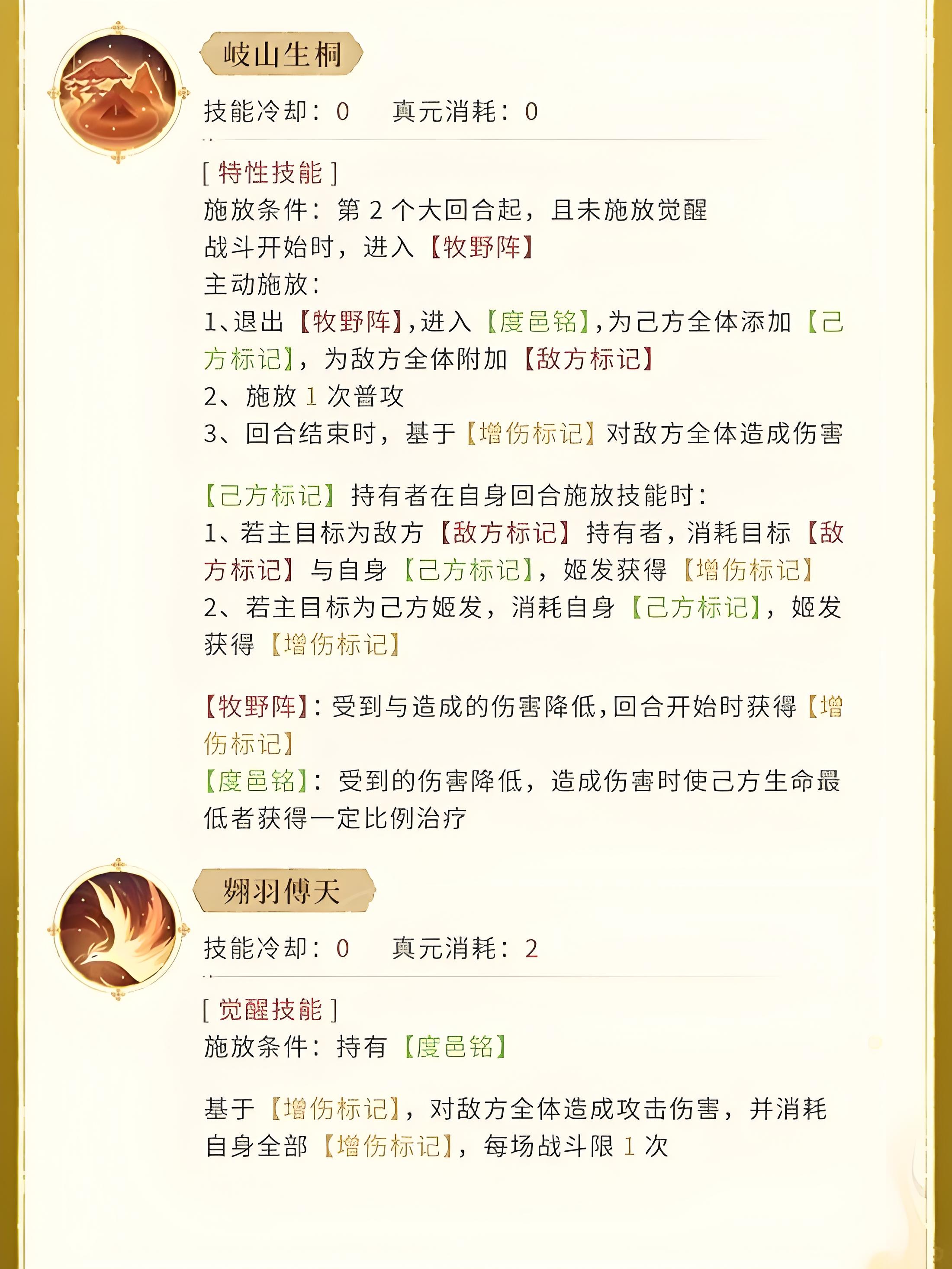 1、核心特性技能岐山生桐無需消耗真元且無冷卻,第二大回合起滿足條件自動觸發(fā)覺醒,初始處于牧野陣狀態(tài)增減全體傷害。