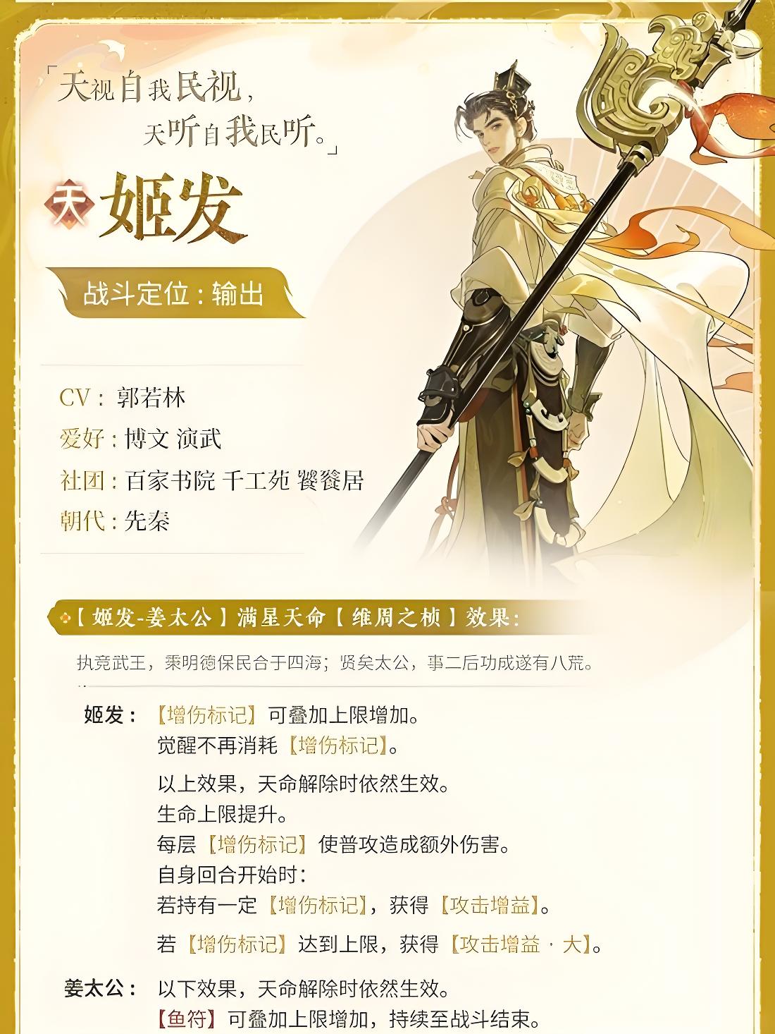 5、滿星天命維周之楨提升生命上限和增傷標記疊加層數(shù),覺醒不消耗標記,天命解除仍保留部分增益,定位核心輸出兼輔助。