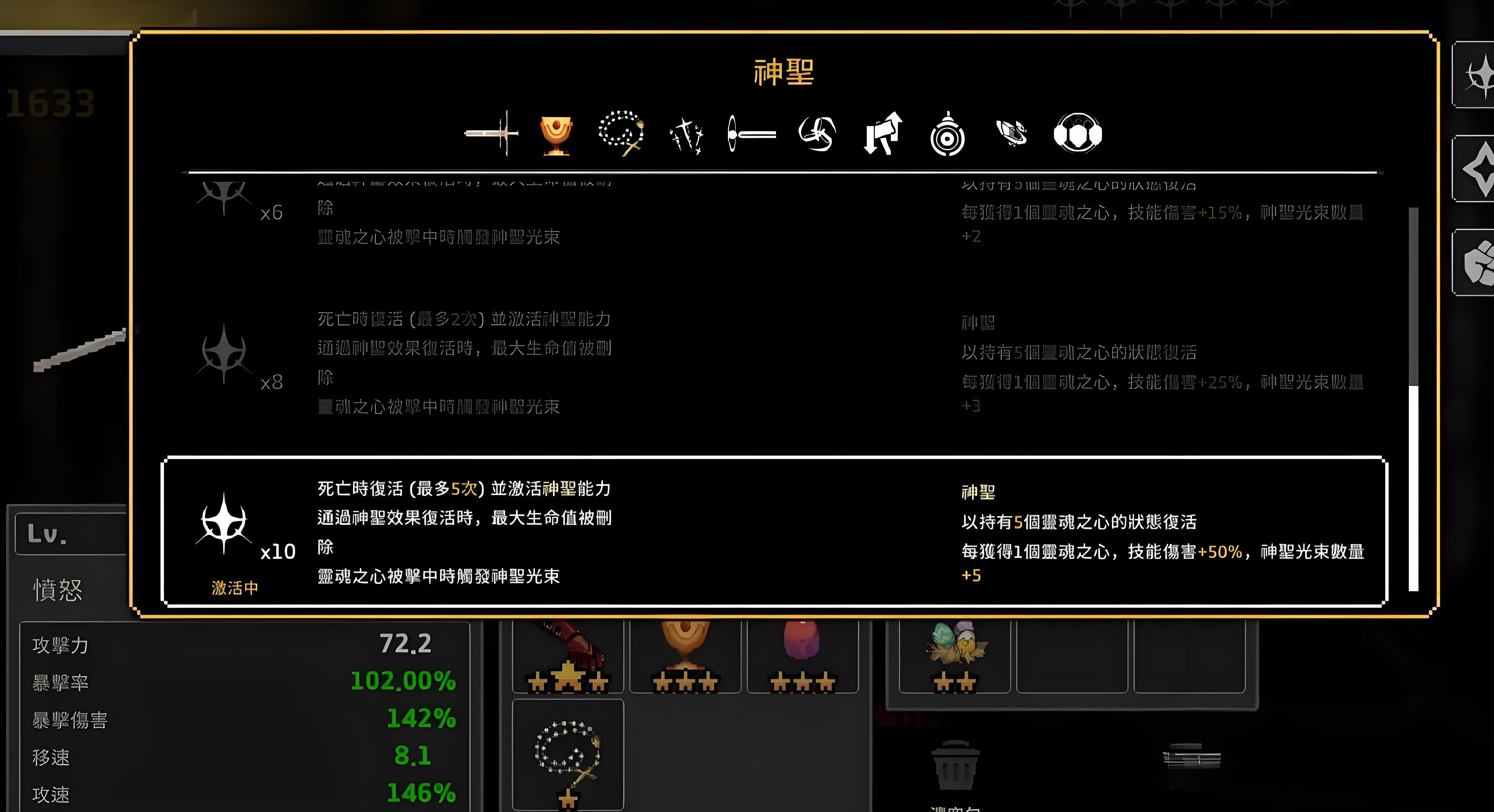 3、技能加點(diǎn)優(yōu)先混沌與秩序天賦,免除龍餐消耗實(shí)現(xiàn)無縫龍化循環(huán),復(fù)活技能投資神圣屬性拉滿五次復(fù)活提升續(xù)航。
