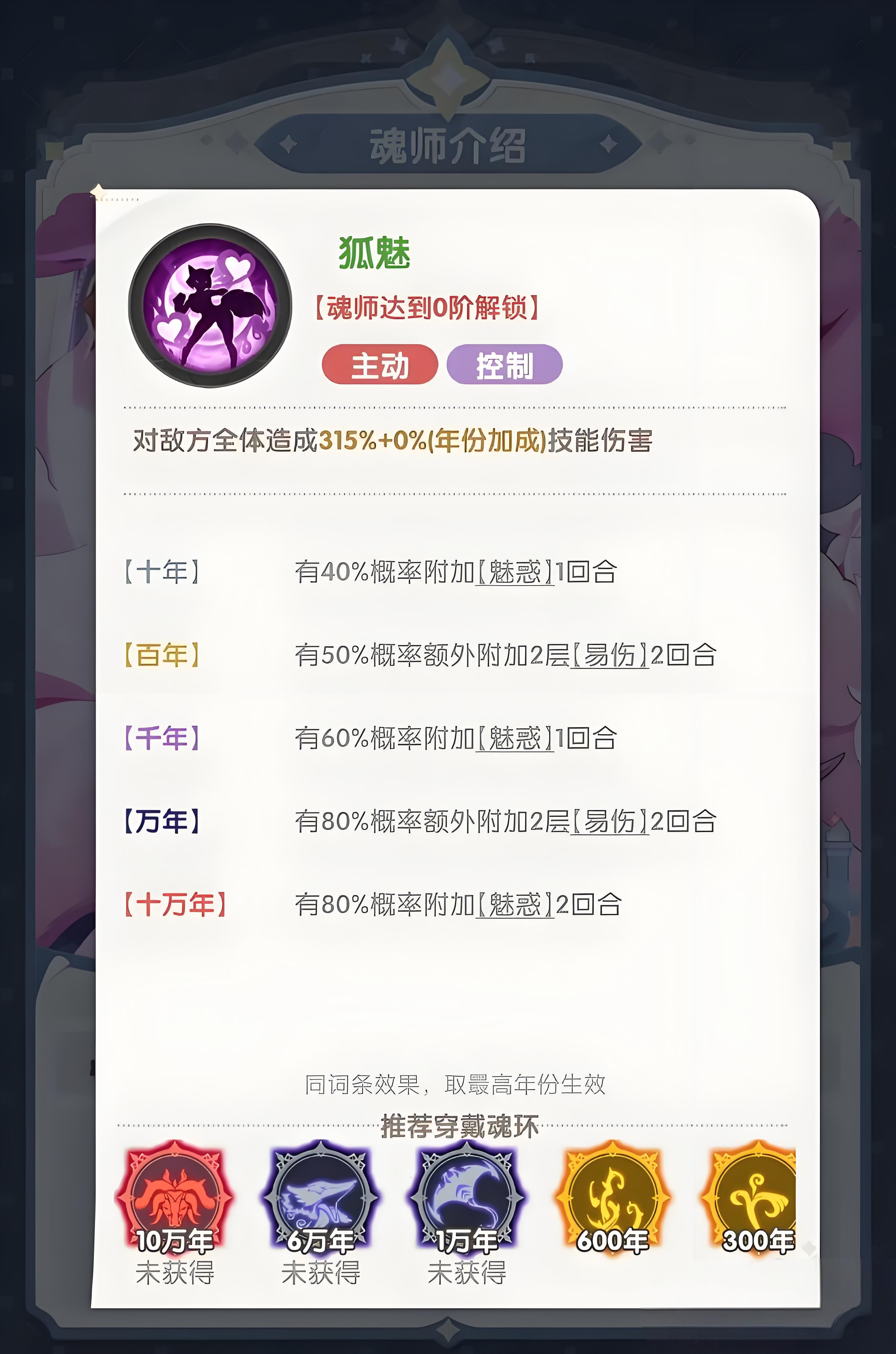 1、主動(dòng)技能狐媚對(duì)敵方全體造成高額技能傷害,隨魂環(huán)年份提升魅惑和易傷附加概率最高達(dá)八十,持續(xù)兩回合限制敵方行動(dòng)。