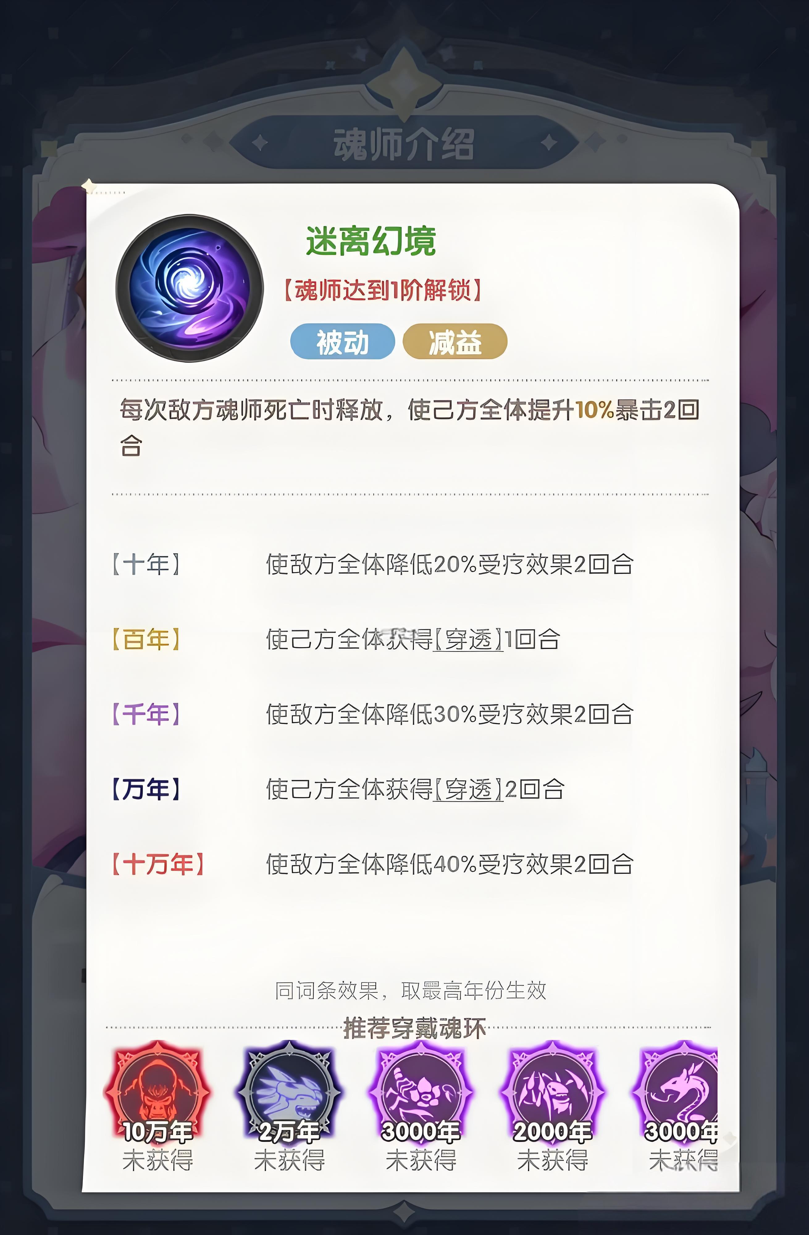 2、被動(dòng)迷離幻境在敵方魂師死亡時(shí)觸發(fā),提升己方暴擊降低敵方受療效果,解鎖穿透效果針對(duì)性克制治療魂師和前排肉盾。