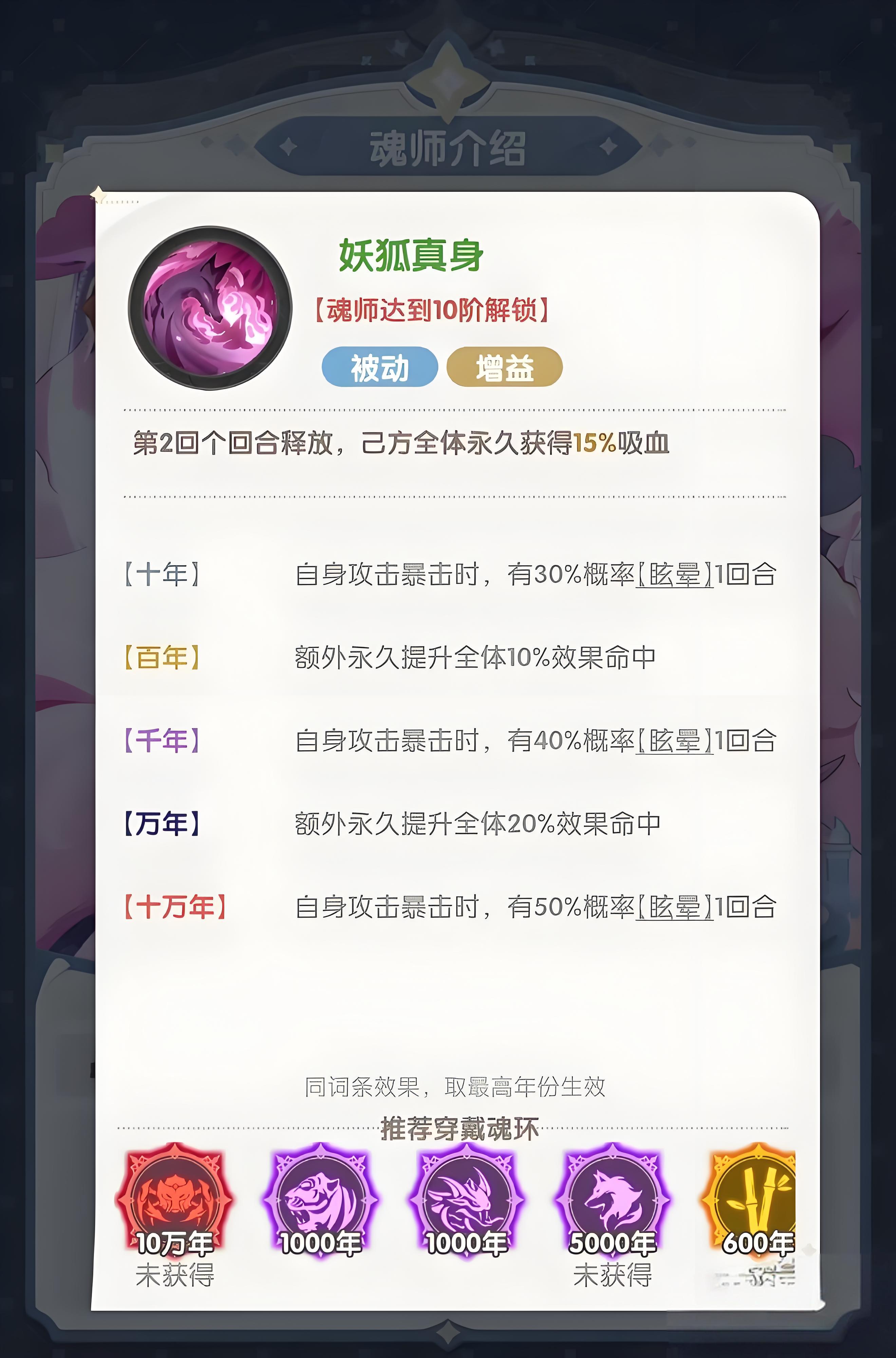 3、被動(dòng)妖狐真身第二回合釋放,己方全體永久獲得吸血加成提升效果命中自身暴擊時(shí)有概率眩暈敵方強(qiáng)化團(tuán)隊(duì)?wèi)?zhàn)力。