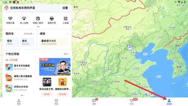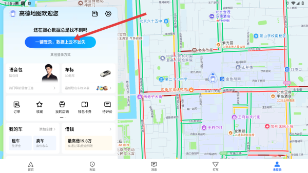 1、打開高德地圖,進入主界面,能看到地圖顯示、各類功能入口,點擊未登錄。