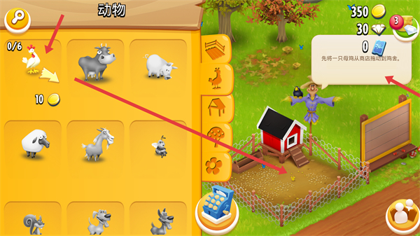 4、可在農(nóng)場里養(yǎng)殖動物,如母雞,先購買母雞,然后將其從商店拖拽到雞舍,開始養(yǎng)殖,獲取動物相關(guān)資源。