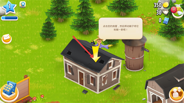 2、農(nóng)場里有破損的房屋,點擊房屋的漏洞,然后拖動刷子粉刷,修復房屋,提升農(nóng)場的建筑外觀和功能。