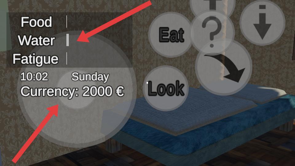 3、左側(cè)會(huì)顯示Food、Water、Fatigue等狀態(tài)條,還有時(shí)間和Currency等信息,要關(guān)注這些,及時(shí)維持生存狀態(tài)。