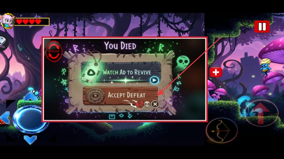 4、若角色生命值耗盡,會出現(xiàn)YouDied的界面,此時可選擇相關按鈕,重新開始冒險,繼續(xù)在森林中闖關,挑戰(zhàn)更多敵人。