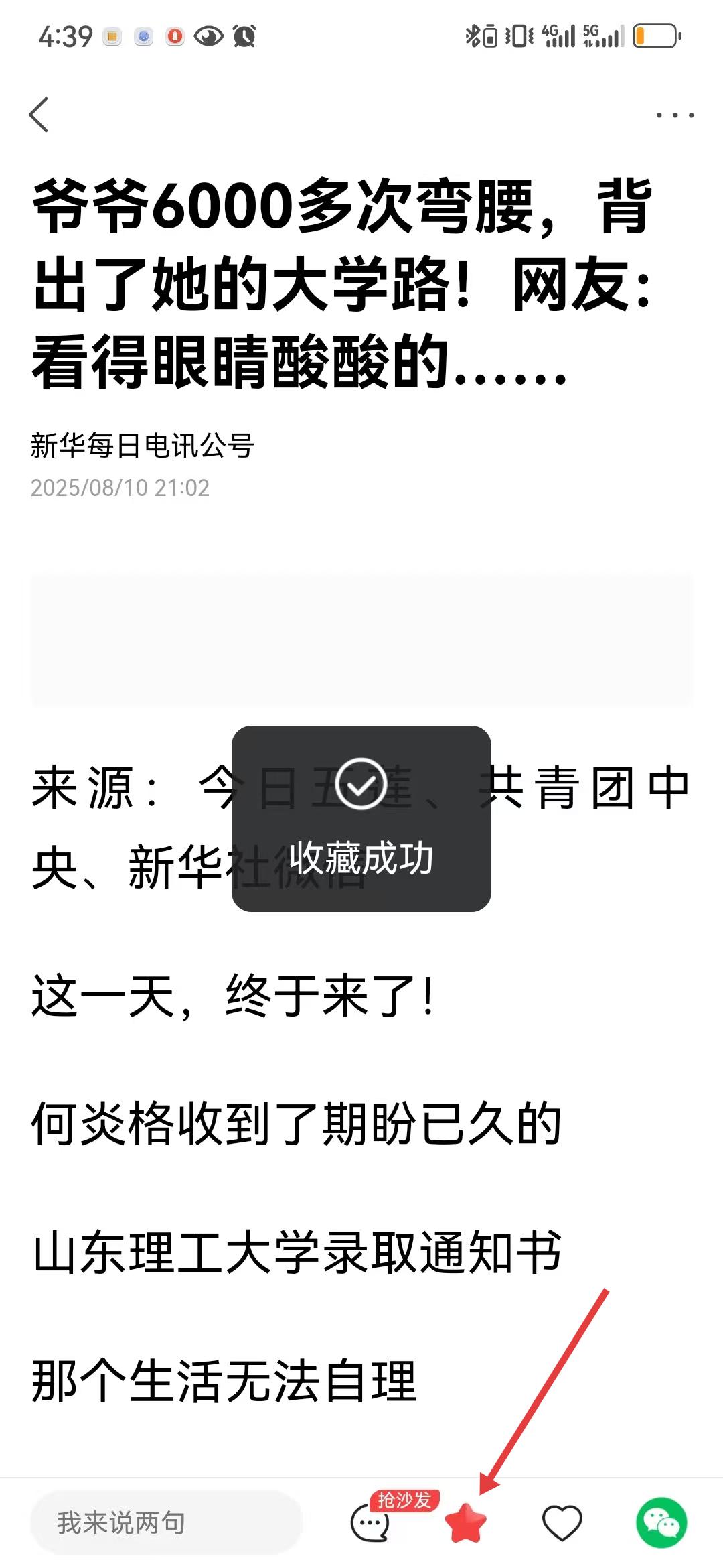 2、在新聞詳情頁底部找到紅色五角星形狀的收藏按鈕,點(diǎn)擊后頁面會彈出收藏成功提示,表明該內(nèi)容已成功加入收藏列表,方便后續(xù)查找回顧。