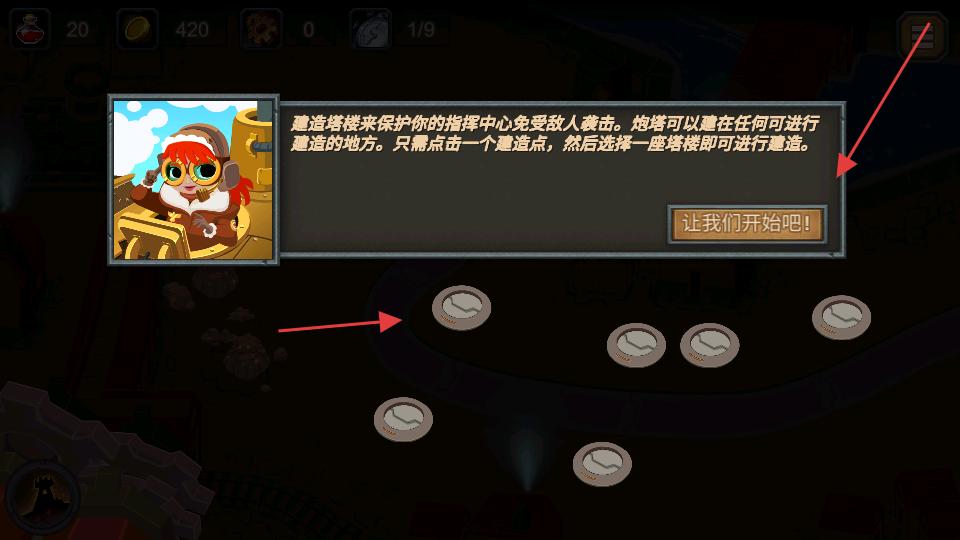 2、教程提示框講解建造塔樓的規(guī)則,要保護指揮中心免受敵人襲擊,可在可建造點建塔樓,點擊讓我們開始吧按鈕可繼續(xù)游戲。