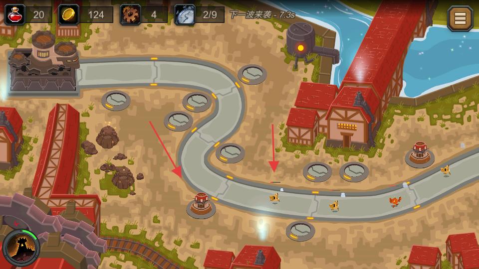 4、戰(zhàn)斗畫面里塔樓對沿路徑行進的敵人發(fā)起攻擊,金幣剩余124,資源有4個,距離下一波敵人到來還有7.3秒,需做好防御準備。