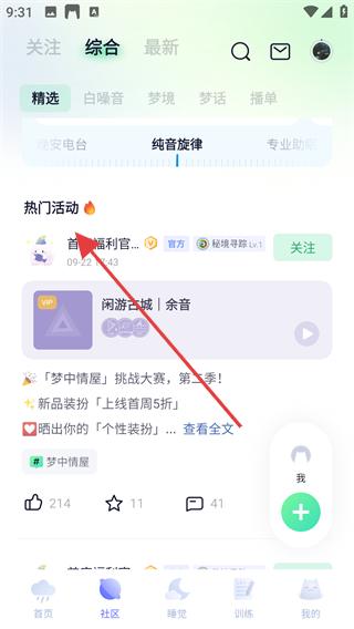 2、在社區(qū)頁面可查看熱門活動里的相關(guān)信息,了解各類活動詳情,若想切換到睡眠相關(guān)功能,點擊底部睡覺按鈕,進入睡眠功能頁面。