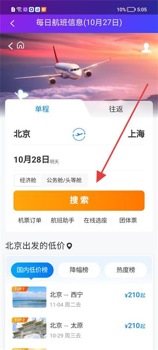 2、確定出發(fā)日期后選擇北京到上海的行程,選擇經(jīng)濟艙或公務(wù)艙,頭等艙,點擊搜索,獲取航班列表。