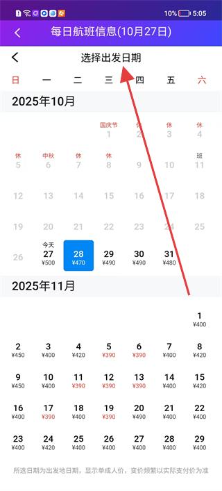1、進入軟件航班信息頁面,選擇出發(fā)日期,在日歷中挑選2025年10月28日等日期,查看對應(yīng)日期的航班價格信息。